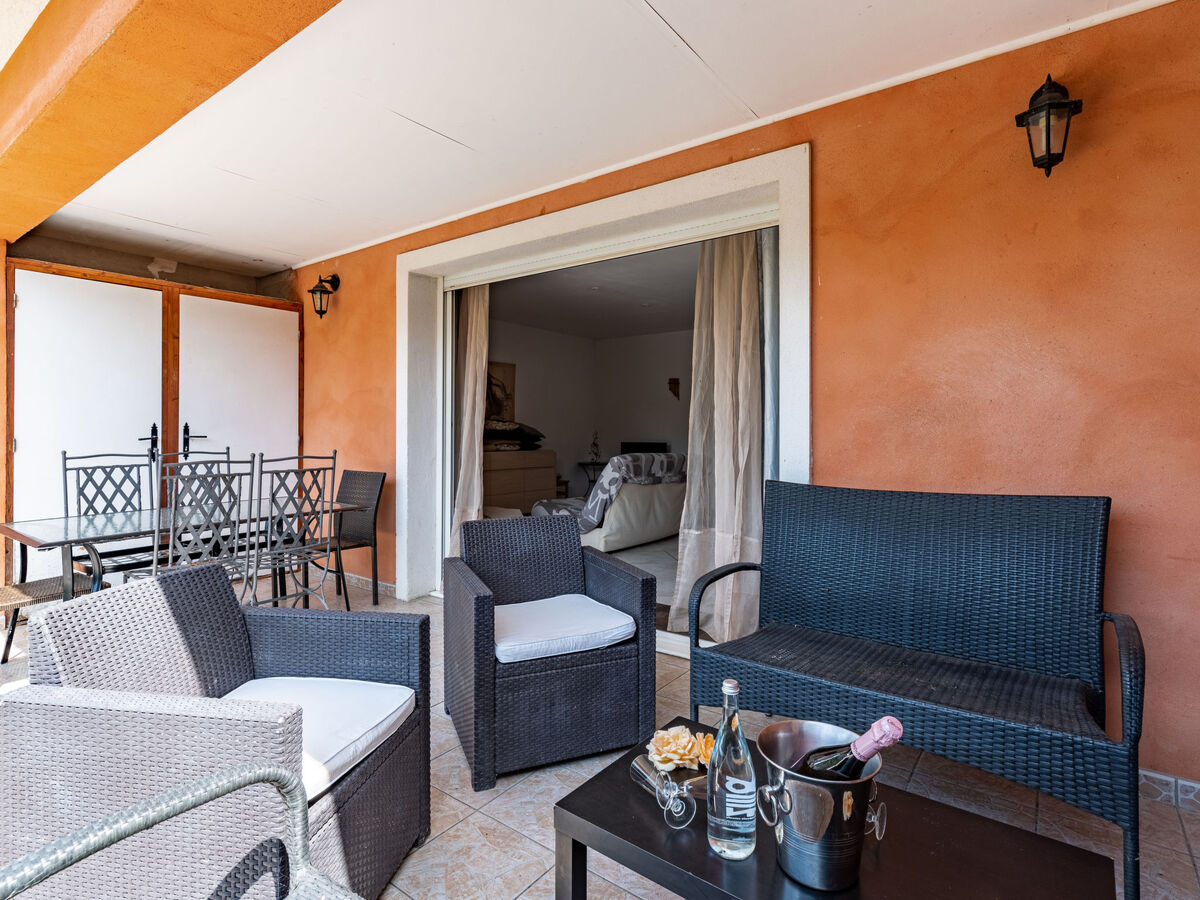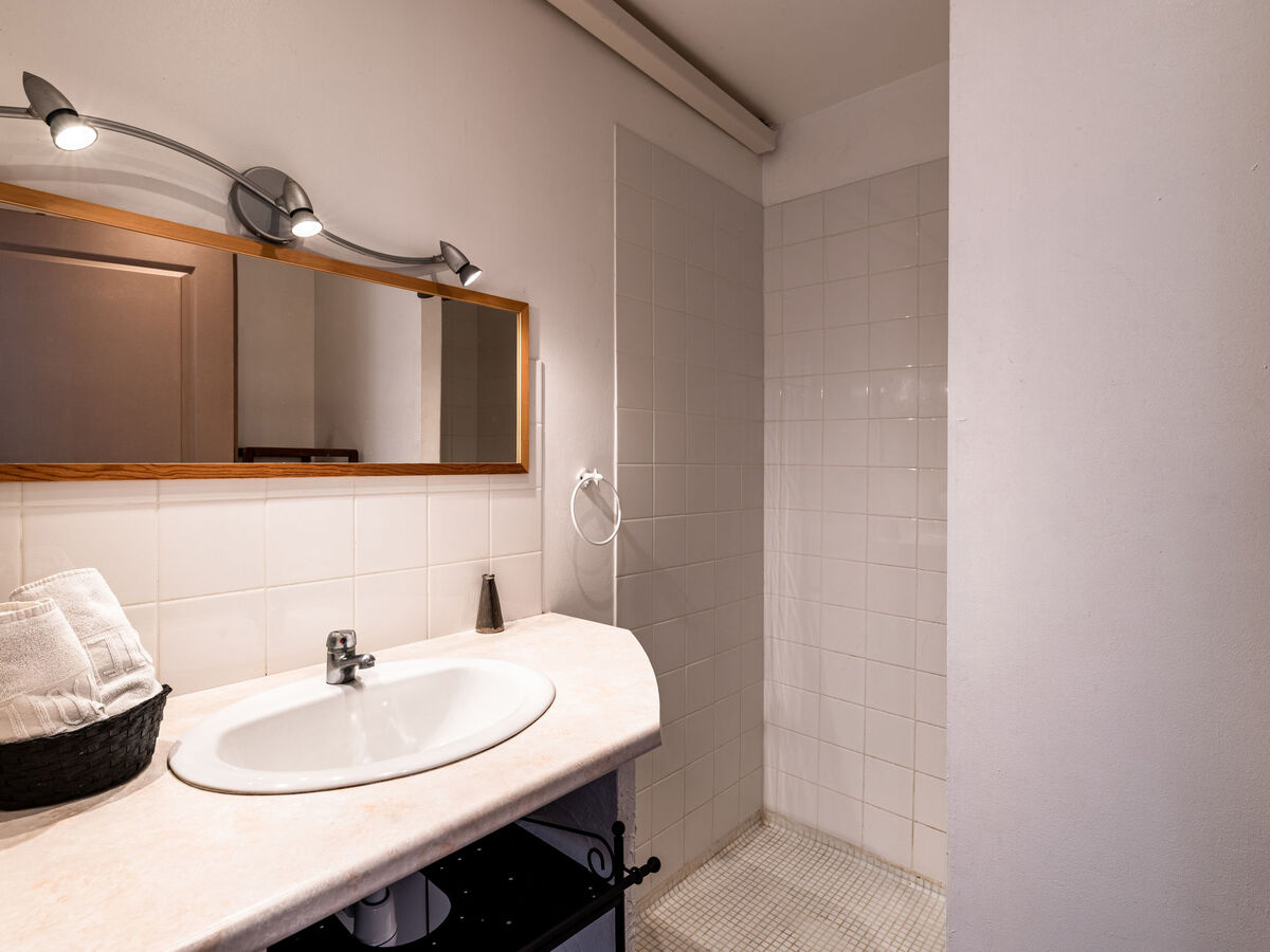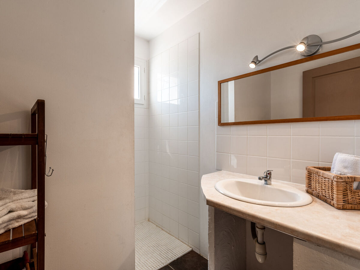 Douche extérieure, terrasse, place de parking sur le terrain.