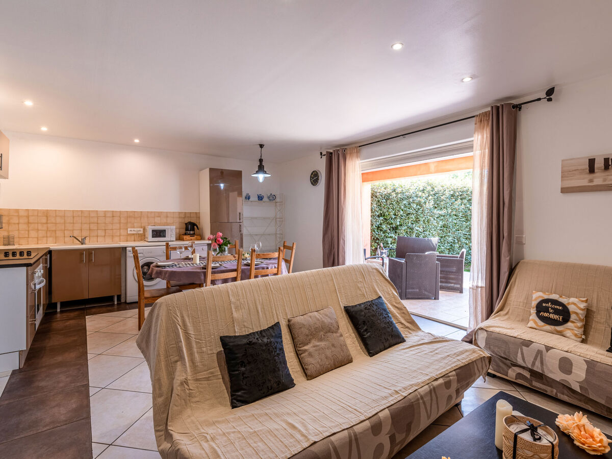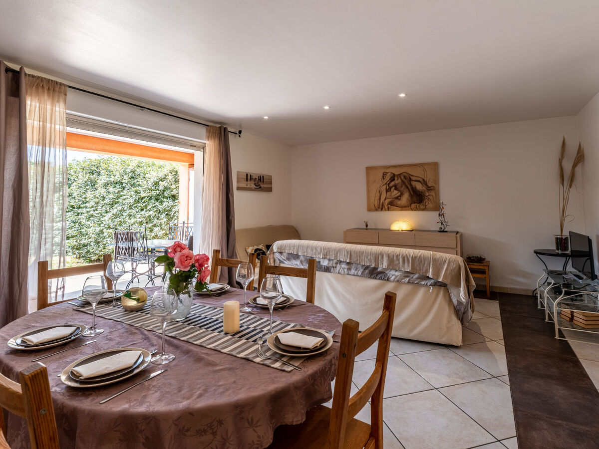 Aménagement fonctionnel et agréable: séjour/salle à manger avec table pour les repas et TV (satellite).