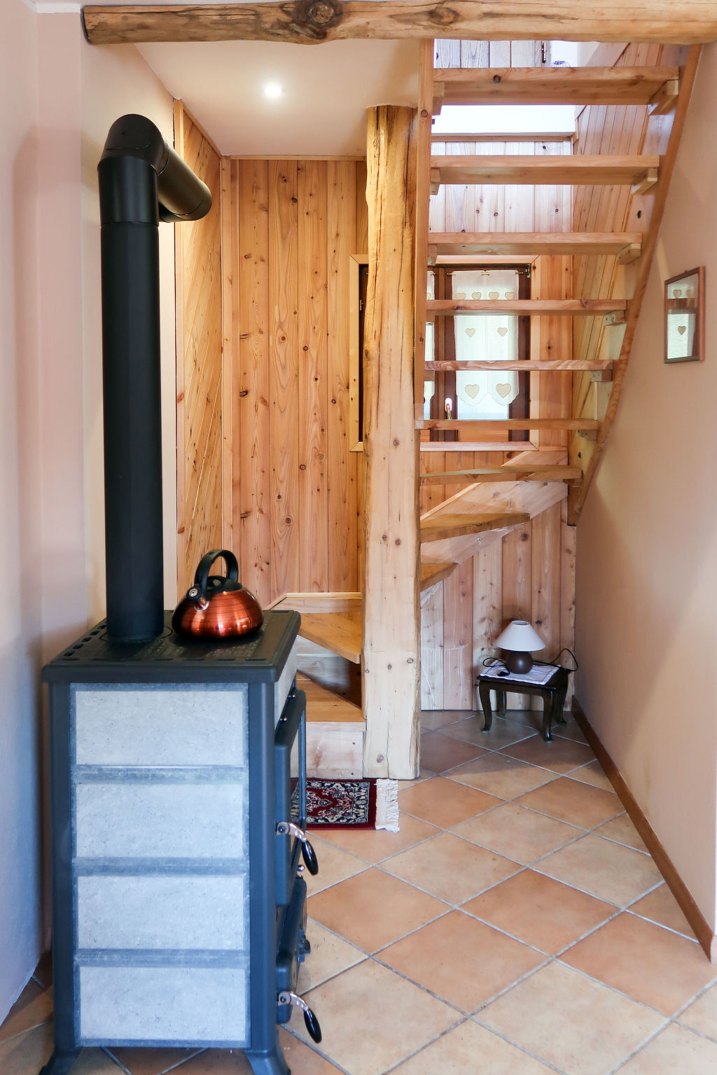 Rénovée en 2013, aménagement fonctionnel et avec beaucoup de bois: séjour/salle à manger avec table pour les repas, TV (satellite) et poêle à bois.