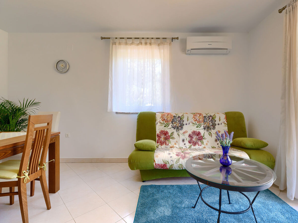 Séjour/salle à manger avec TV (satellite) et air-conditionné.