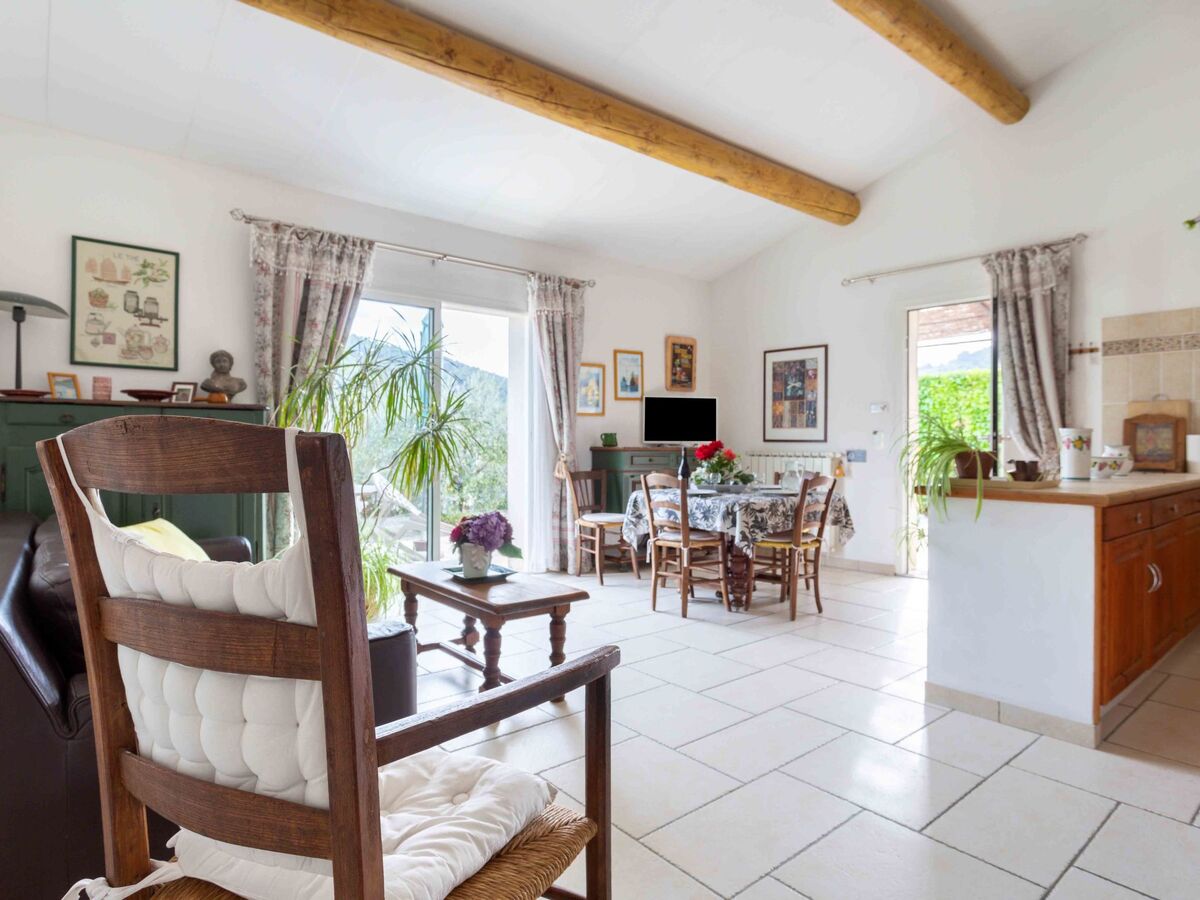 Clair, rénovée en 2002, aménagement fonctionnel: séjour/salle à manger avec table pour les repas et TV.