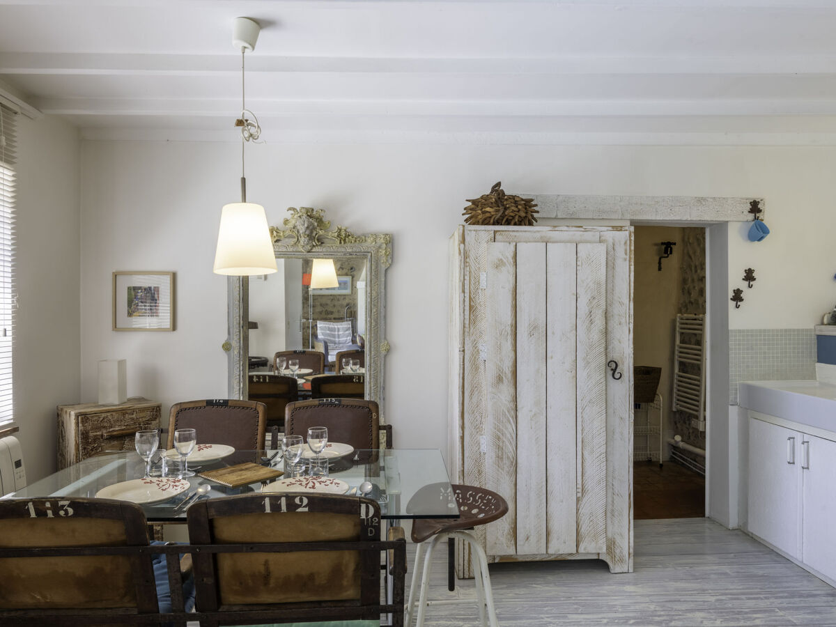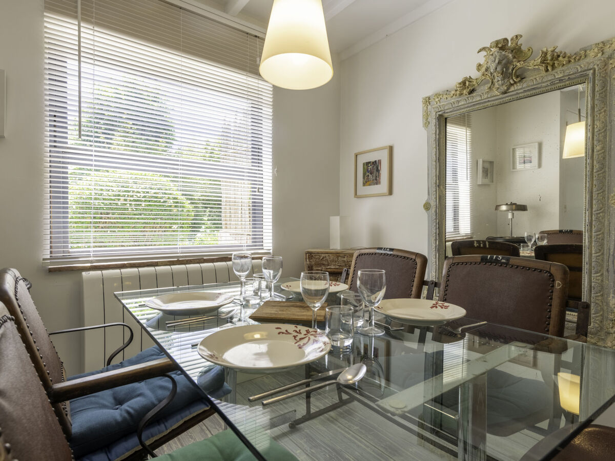 Clair, aménagement confortable et de bon goût: séjour/salle à manger avec cheminée, table pour les repas, TV (satellite), chaîne stéréo et DVD.