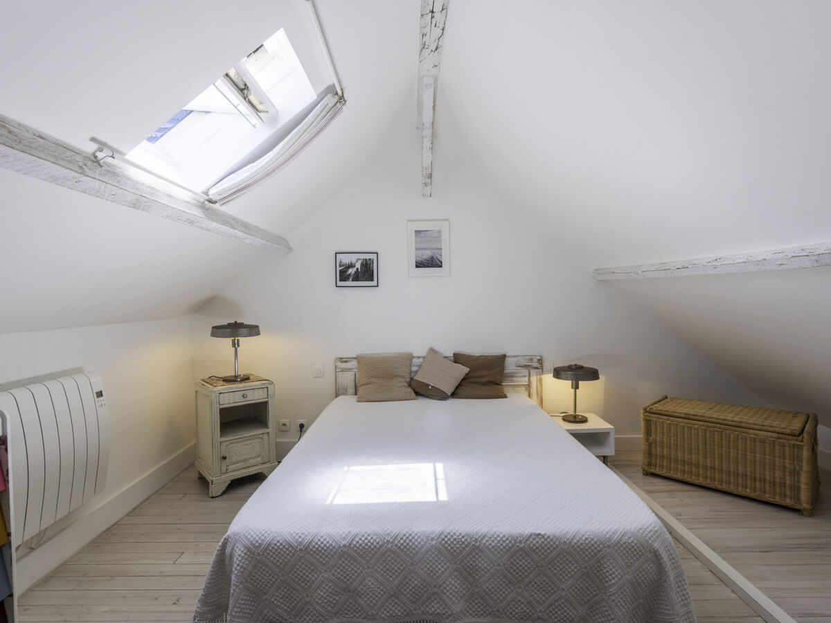 Pièce en enfilade mansardée avec fenêtre sous le toit avec 1 grand-lit.