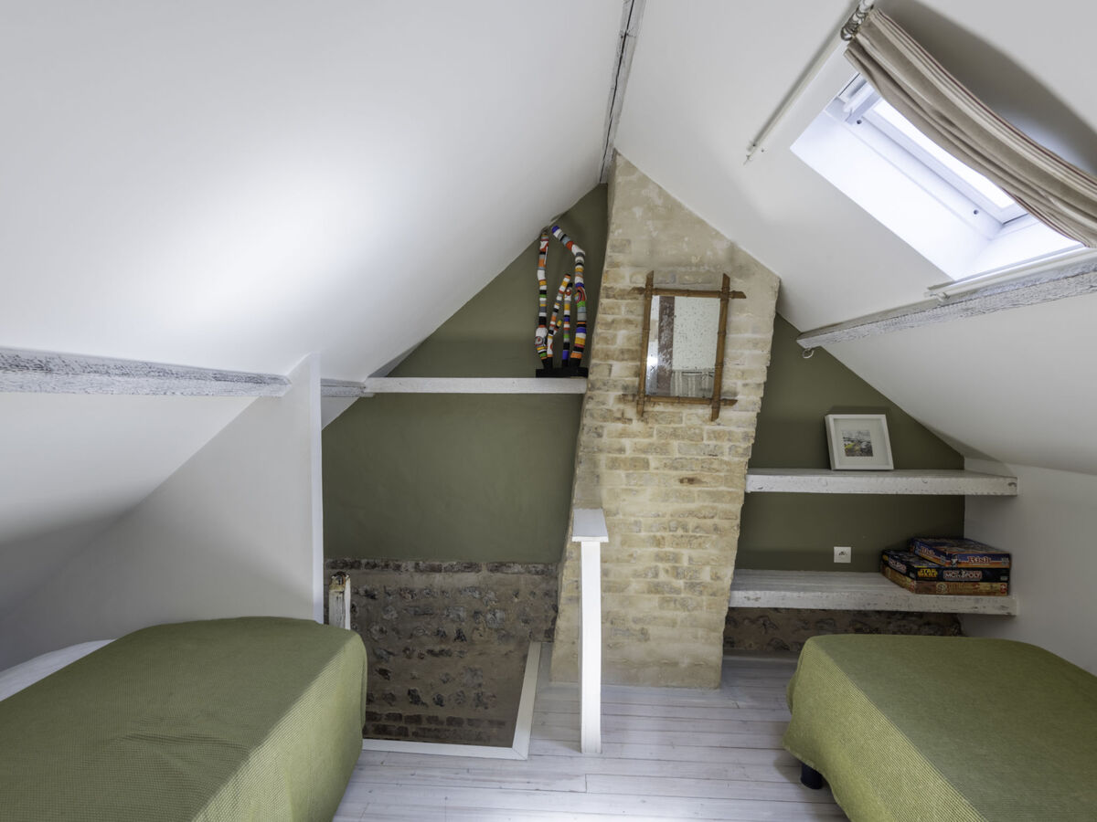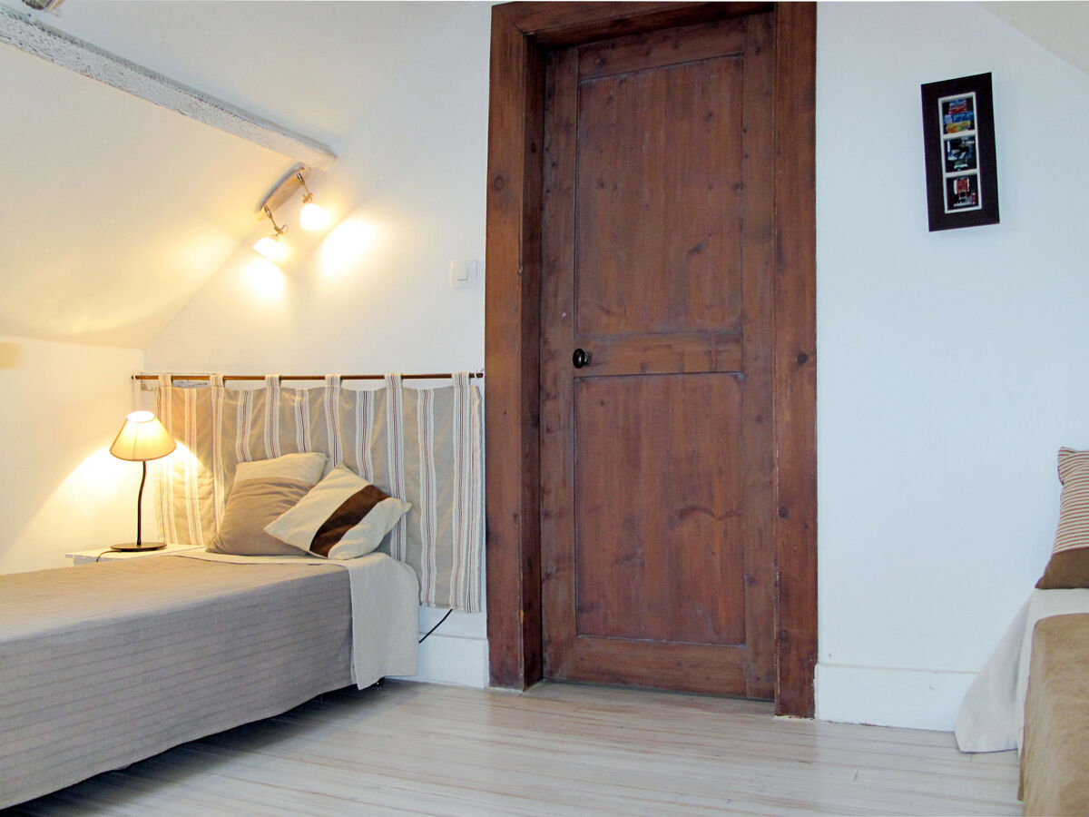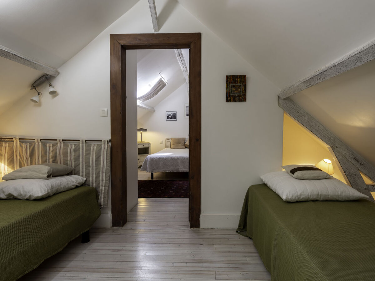 À l'étage supérieur: chambre avec passage mansardée, ouverte avec fenêtre sous le toit avec 2 lits (80 cm).