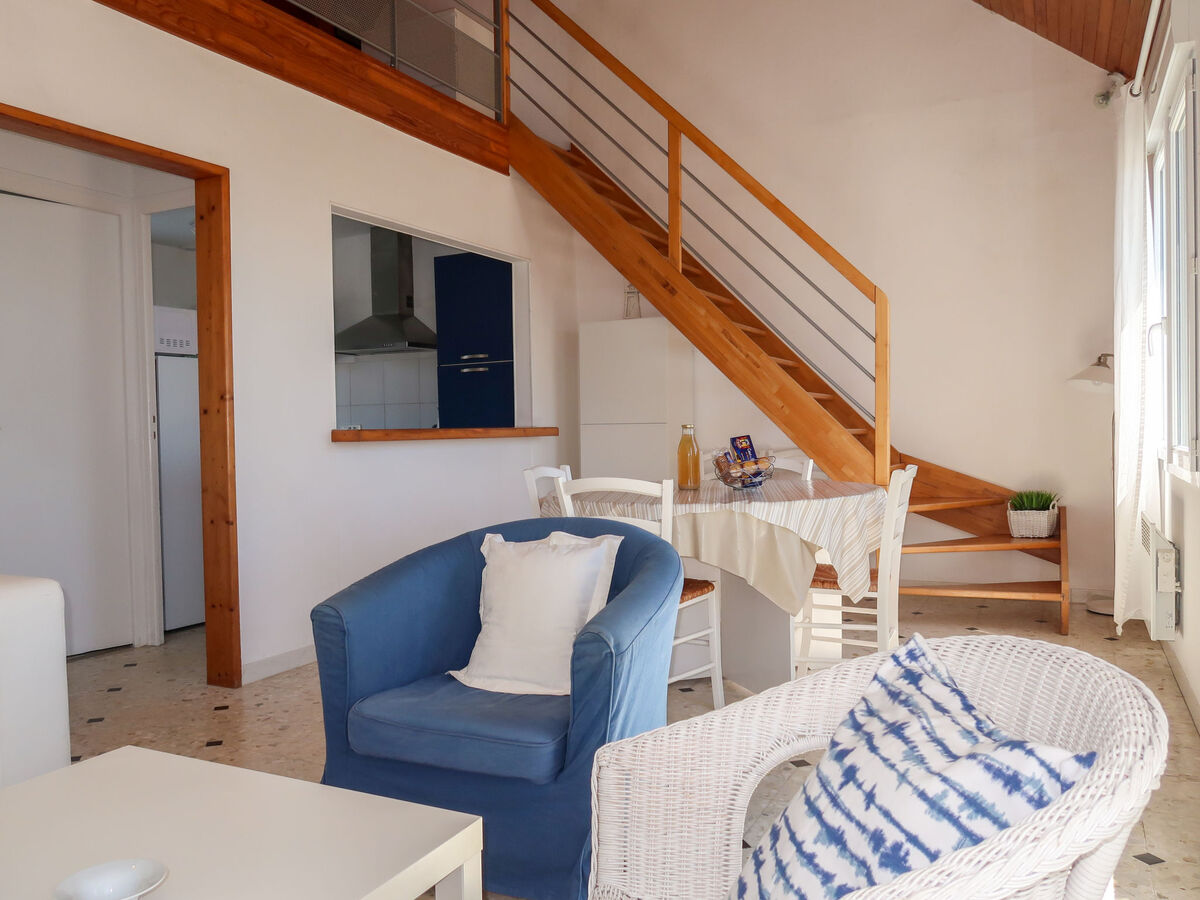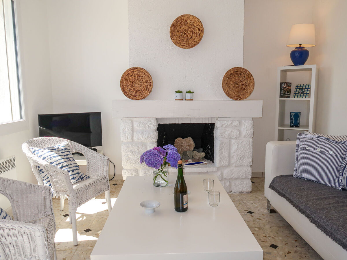 Aménagement fonctionnel et plaisant: séjour/salle à manger avec cheminée (uniquement à titre de décoration), table pour les repas, TV (satellite) et chaînes de TV internationales.