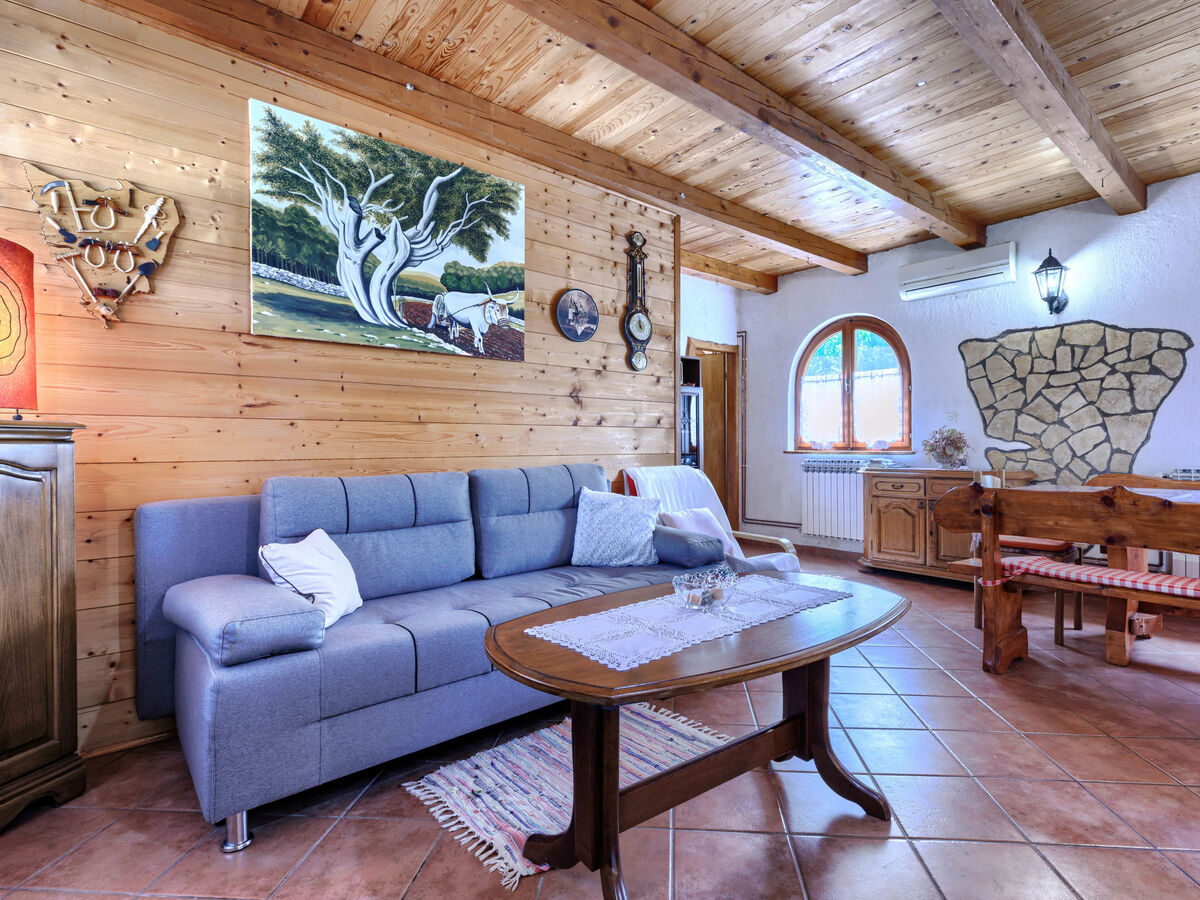 Séjour/salle à manger avec 1 divan-lit double, cheminée, TV (satellite) et air-conditionné.