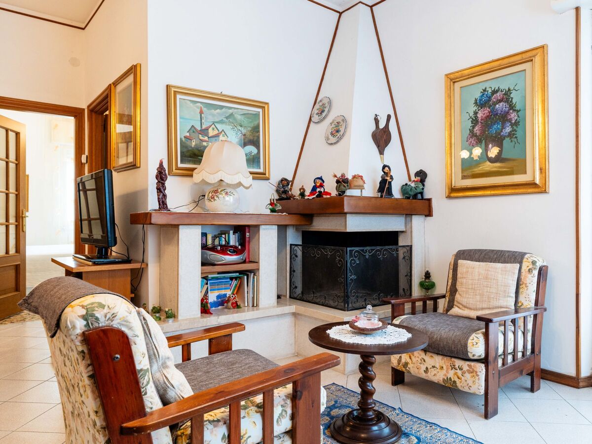 Aménagement à l'ancienne et romantique: séjour/salle à manger avec cheminée (uniquement à titre de décoration), table pour les repas et TV (satellite).