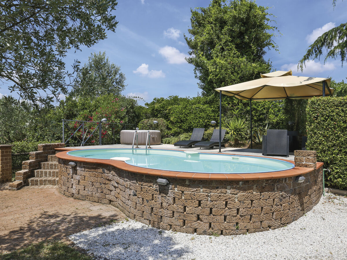A usage privé: terrain 500 m2 (clôturé) avec arbres, champ, piscine (hors sol) en forme d’haricot (8 x 5 m, profondeur 130 cm, disponibilité saisonnière: 10.Mai.