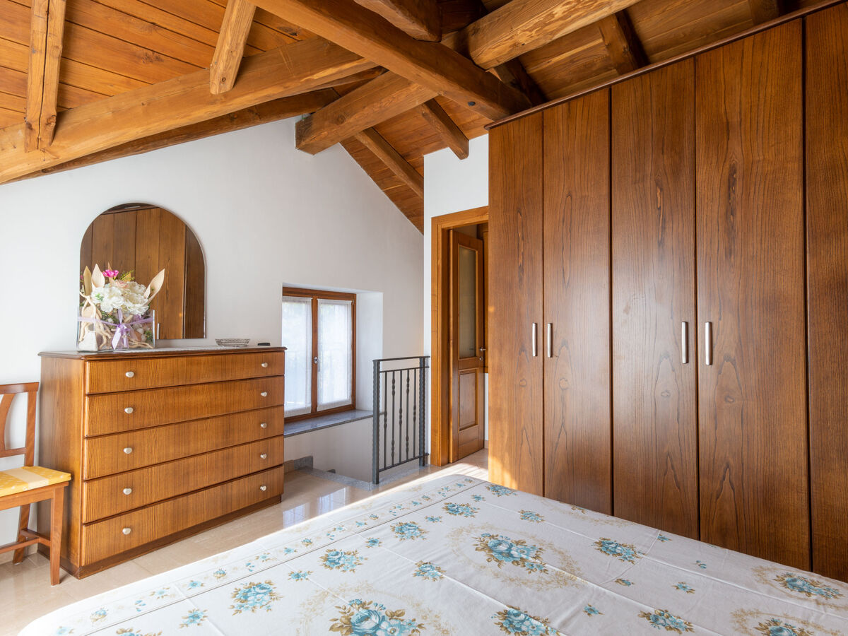 À l'étage supérieur: 1 chambre, mansardée, ouverte avec 1 grand-lit (160 cm).