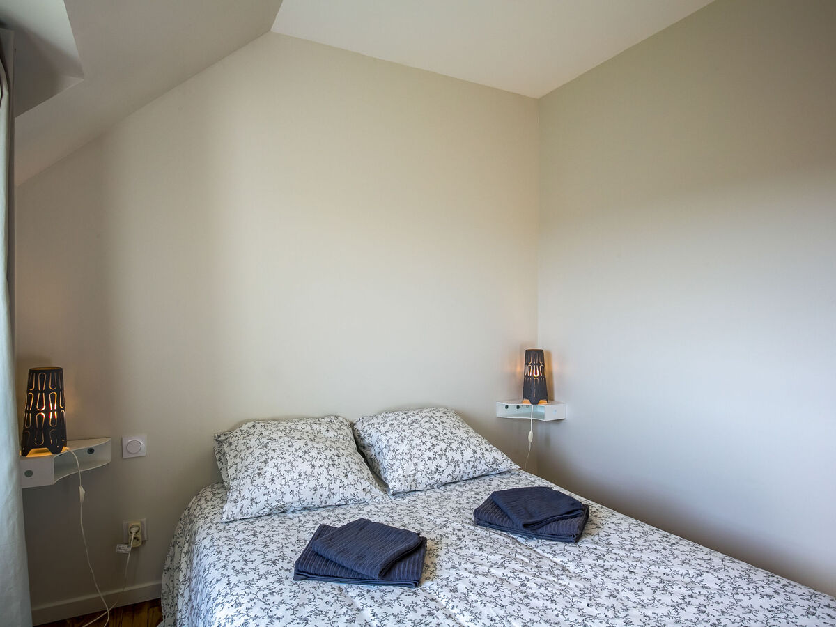 À l'étage supérieur: 1 chambre avec 1 grand-lit (140 cm, longueur 190 cm).
