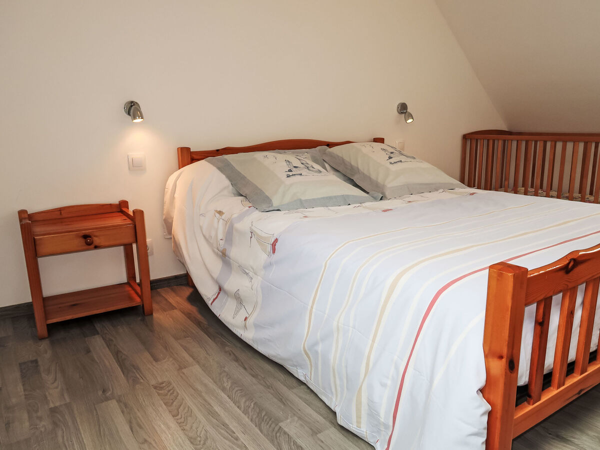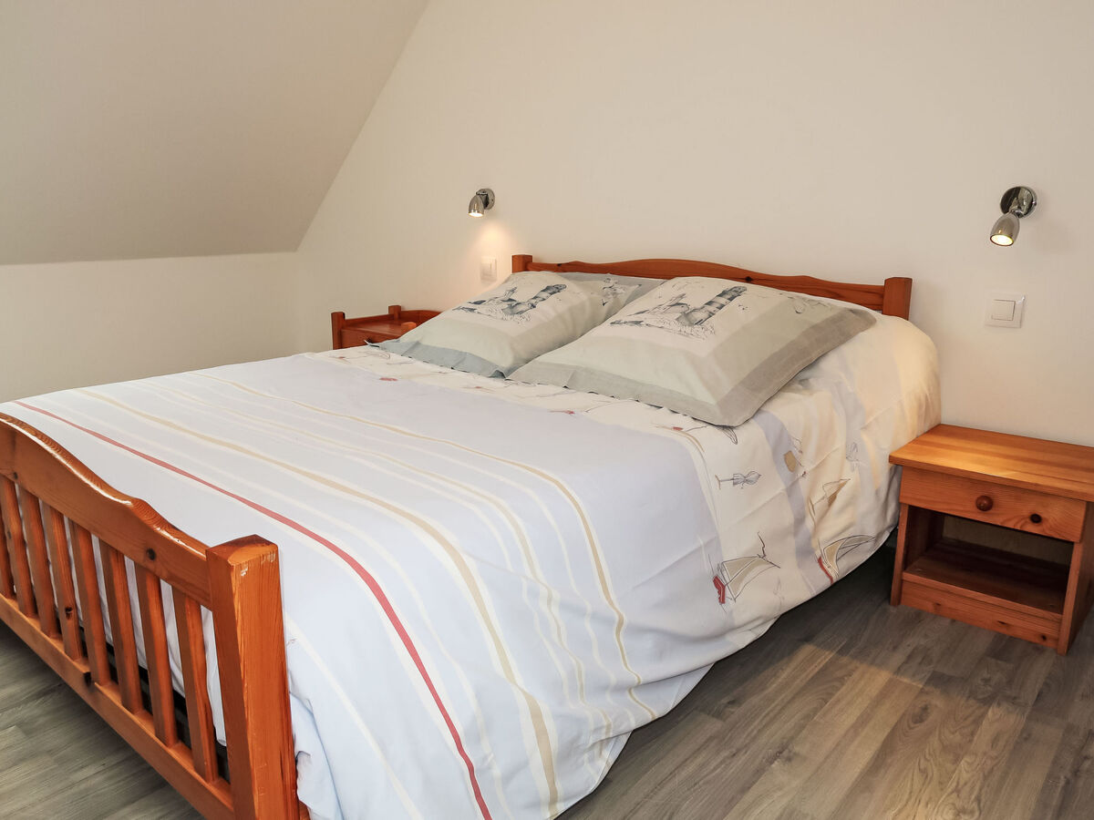 À l'étage supérieur: 1 chambre, mansardée avec 1 grand-lit (140 cm, longueur 190 cm).