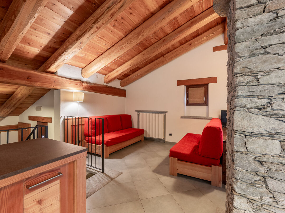 À l'étage supérieur: séjour/chambre à coucher ouvert avec 2 divans-lits, cheminée, table pour les repas et TV (satellite).