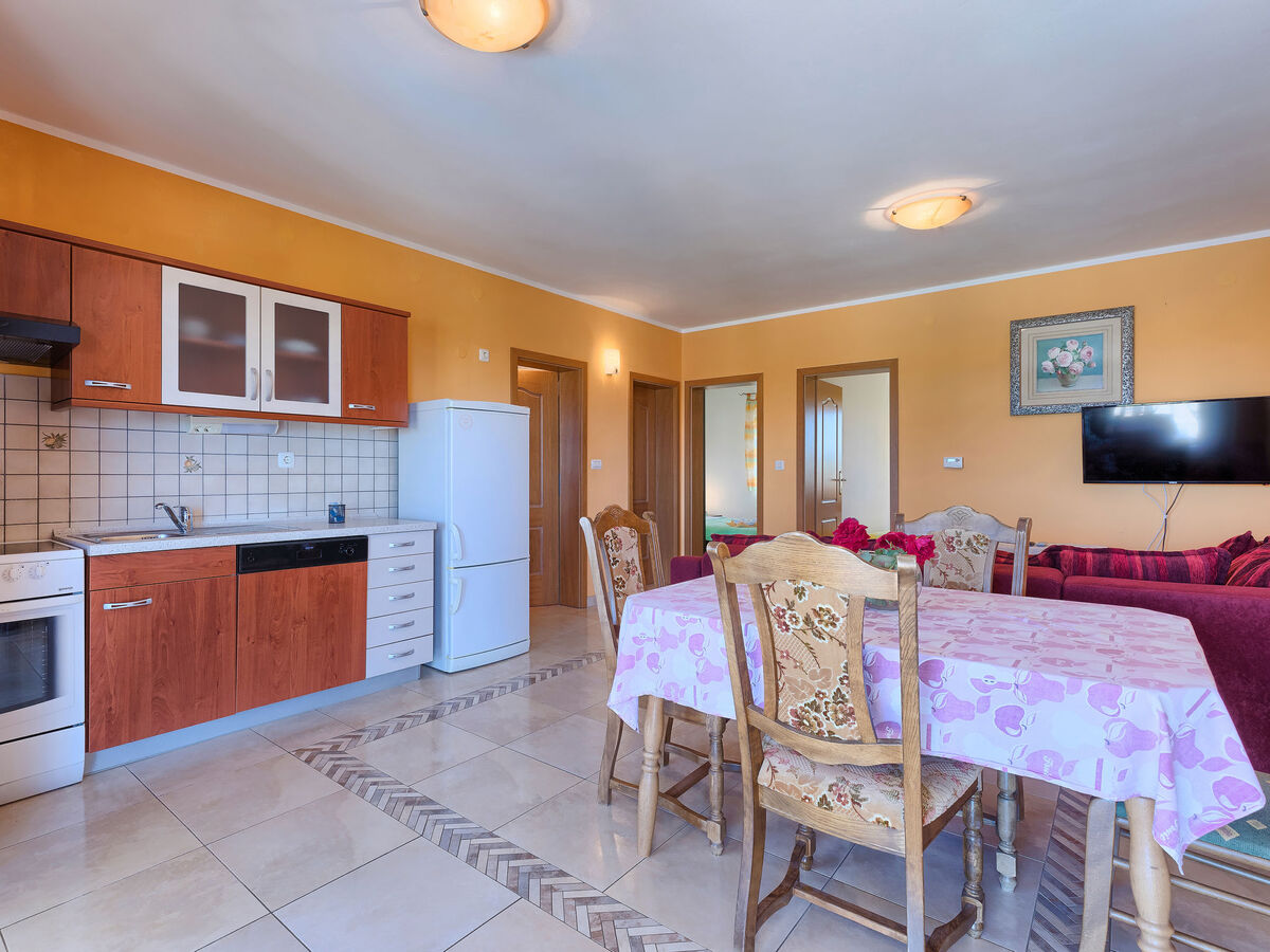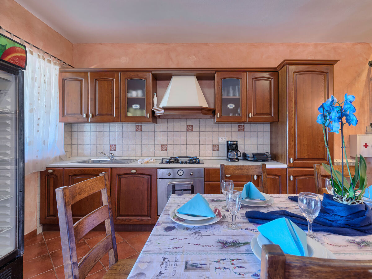 Cuisine ouverte (4 plaques de cuisson, four, micro-ondes, congélateur, cafetière électrique) avec table pour les repas, air-conditionné.