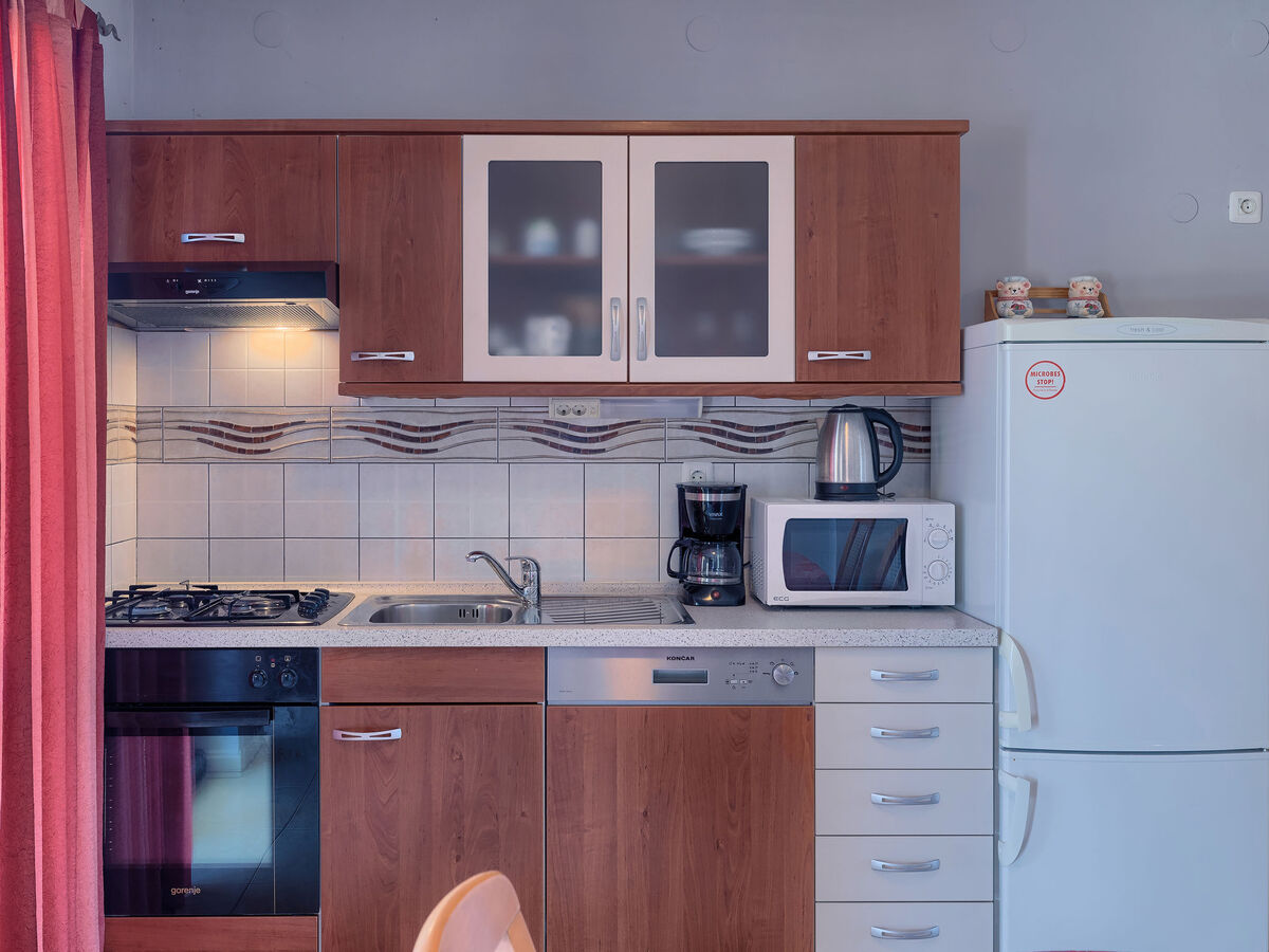 Cuisine (four, lave-vaisselle, 4 plaques vitrocéramiques, cafetière électrique) avec air-conditionné.