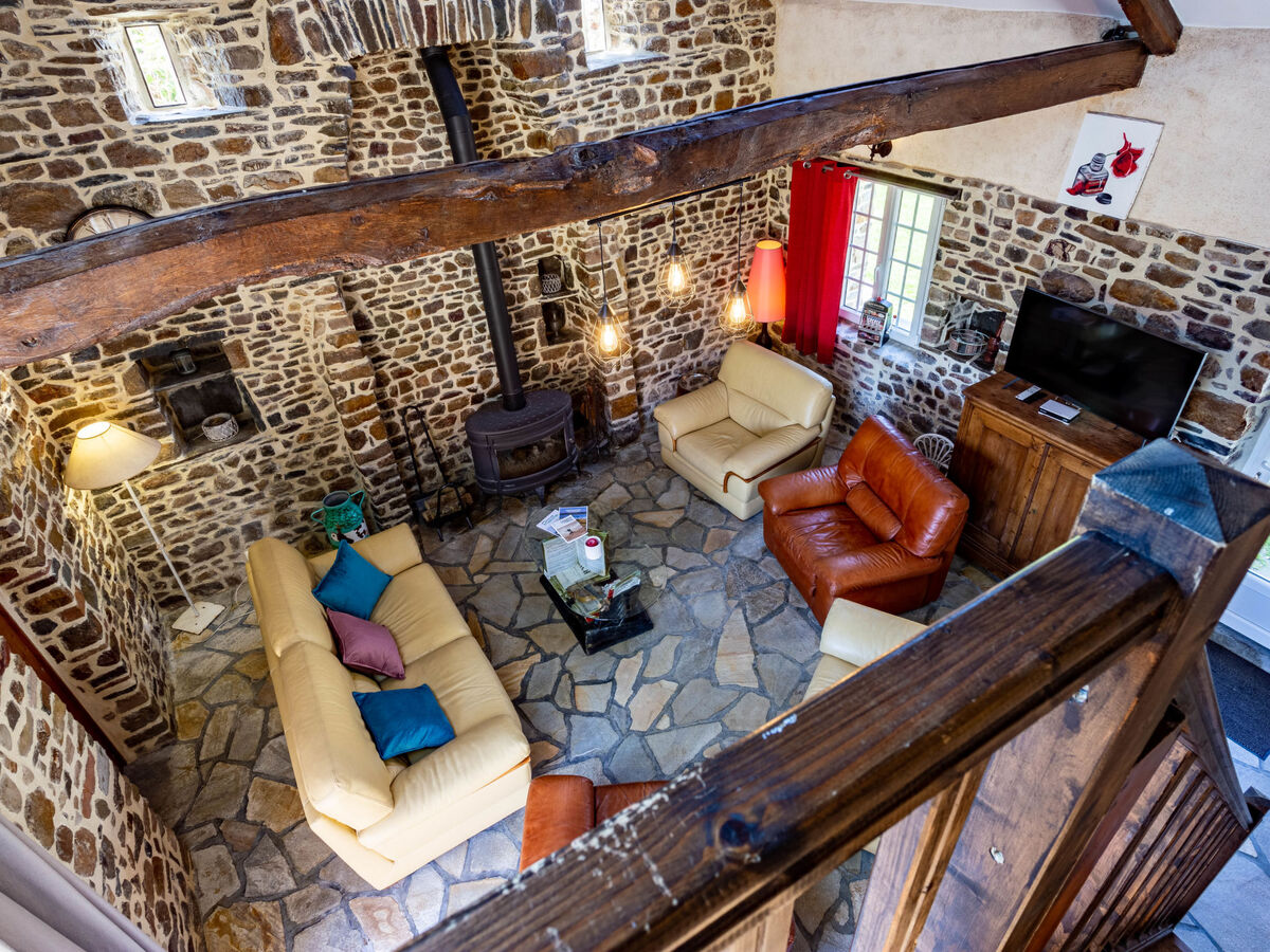 Aménagement rustique et plaisant: séjour avec TV (satellite), DVD et poêle à bois.