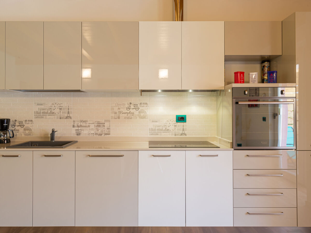 Cuisine ouverte (four, lave-vaisselle, 4 plaques à induction, grille-pain, congélateur, cafetière électrique).