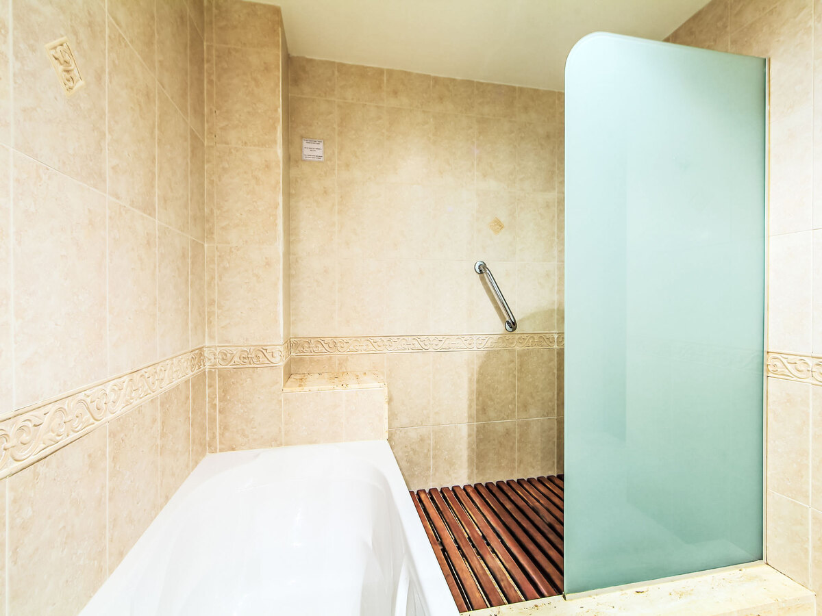 Spacieux et clair, aménagement luxueux et de style: 1 chambre 16 m2 avec 1 grand-lit (140 cm, longueur 200 cm), bain/douche/WC, Télévision numérique et air-conditionné avec WC séparés.