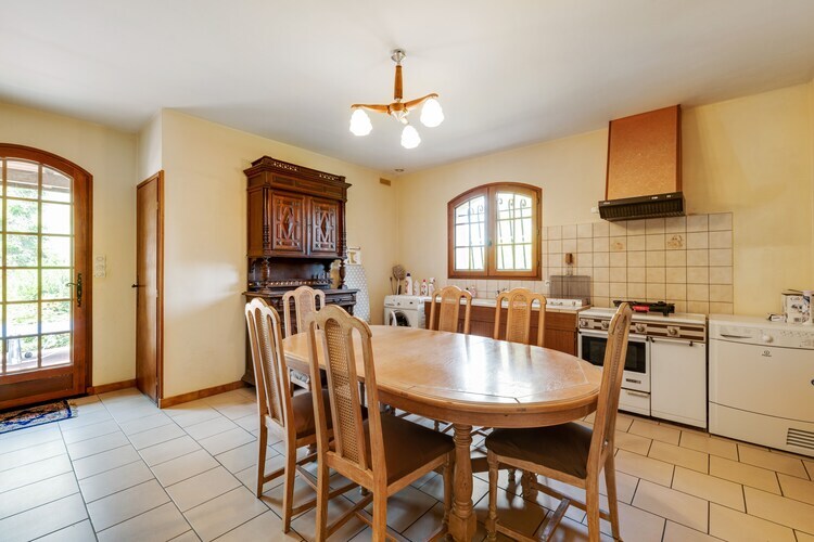 Rez-de-chaussée: (Entrée, cuisine(table(8 personnes), plaque de cuisson(4 foyers, gaz), cafetière/percolateur(filtre), four, micro ondes, lave-vaisselle , combinaison réfrigérateur/congélateur), cuisine(table(4 personnes), plaque de cuisson(4 foyers), sèche-linge, lave-linge ), salle à manger-salon(TV(cable, écran plat), table(8 personnes), cheminée), chambre(Lit superposé), chambre(lit double(160 x 200 cm)), chambre(lit double), salle de bains(douche, lavabo), salle de bains(baignoire-douche, lavabo, bidet), bureau(canapé-lit double(140 x 190 cm)), WC, WC) garage(accès par l'extérieur), chauffage(central), terrasse(privé), jardin(privé, > 1000 m2), mobilier de jardin(8 personnes), barbecue(charbon de bois), parking, chaises longues, parasol, lit d'enfant, chaise haute