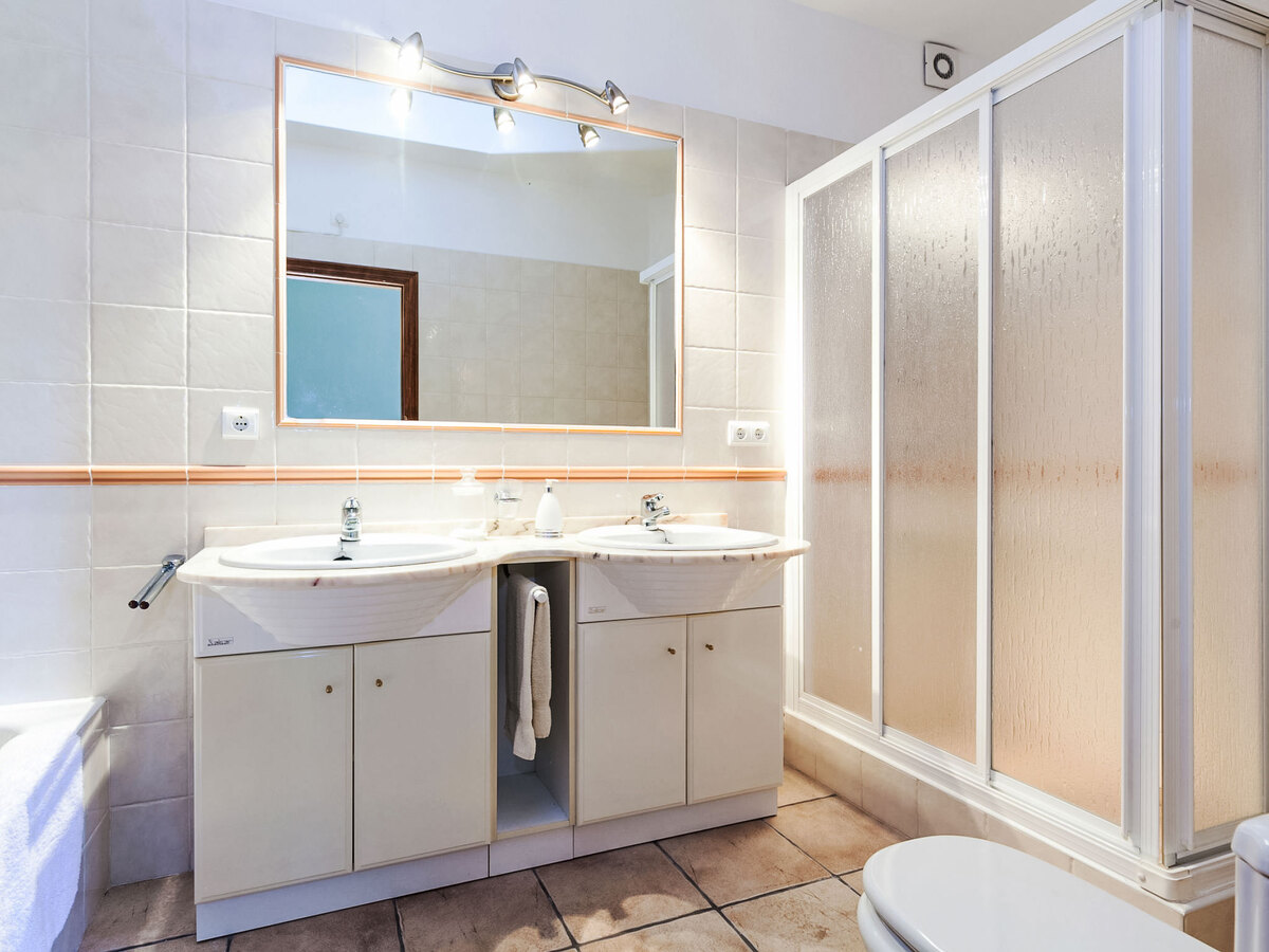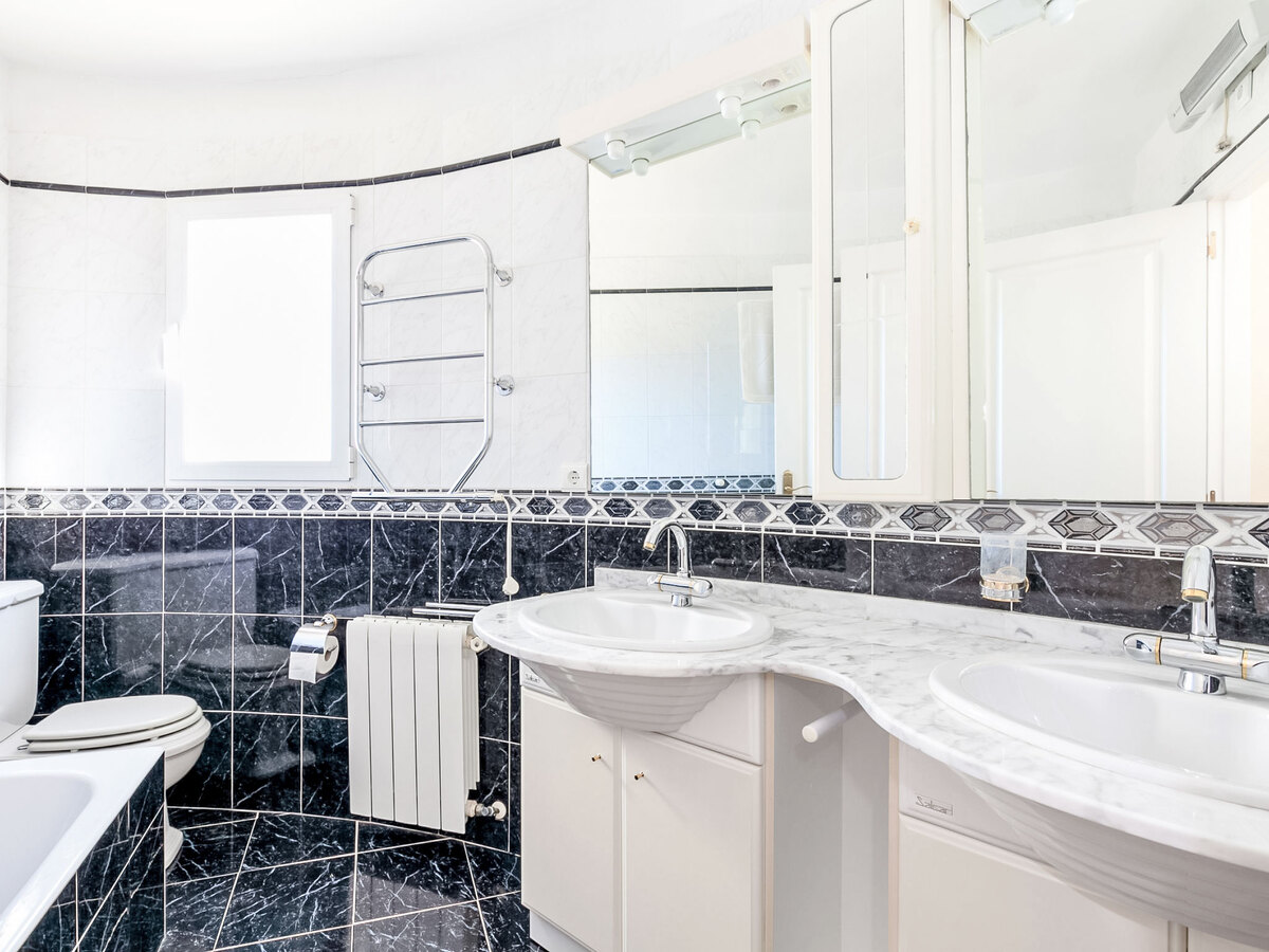 1 grande chambre avec Dressing avec 1 grand-lit (180 cm, longueur 190 cm), bain/douche/bidet/WC, double vasque, air-conditionné et chauffage à air chaud.