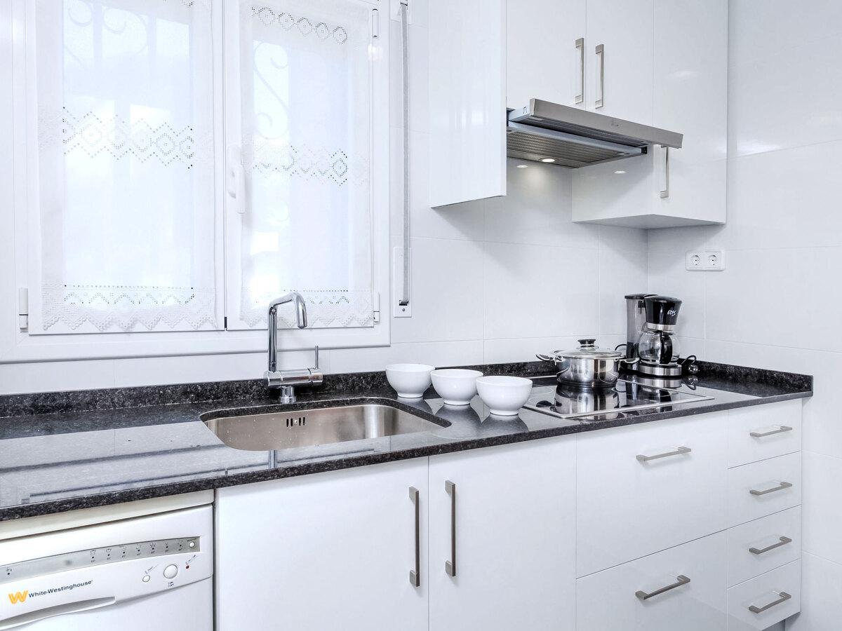 Petite cuisine (four, lave-vaisselle, 4 plaques vitrocéramiques, grille-pain, bouilloire électrique, micro-ondes, cafetière électrique).
