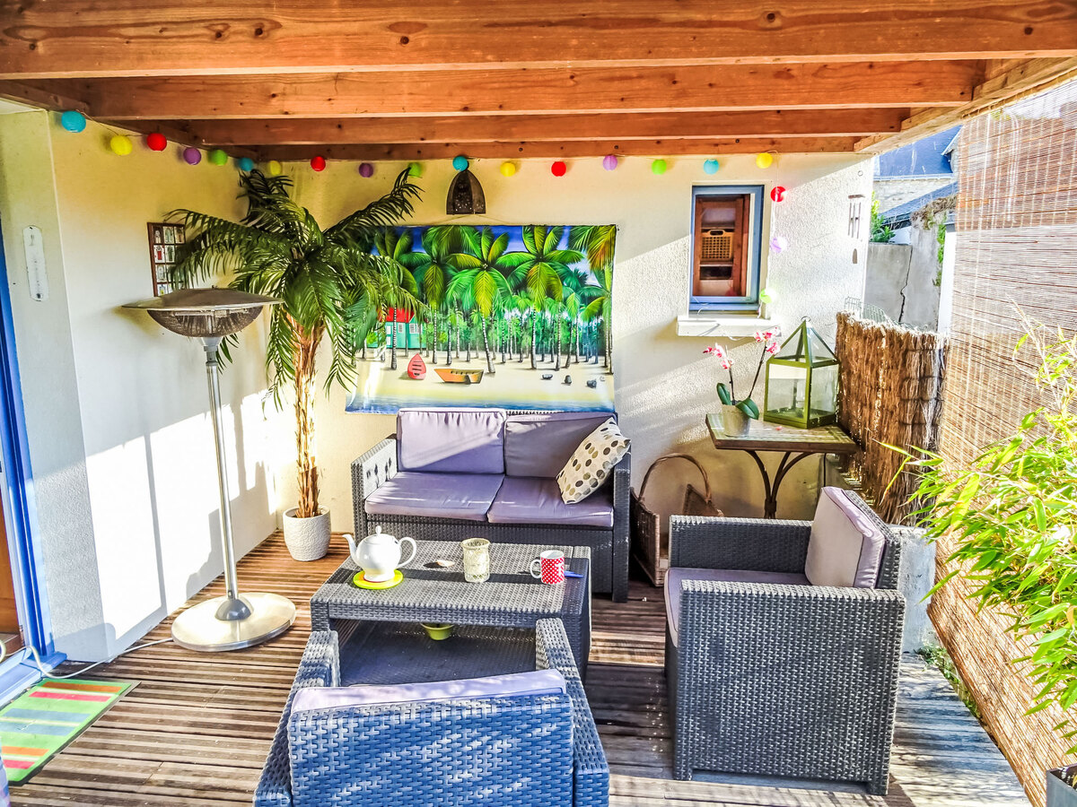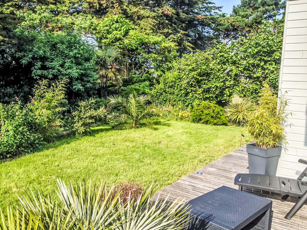 A usage privé: jardin entretenu (pas clôturé), place de parking (pour 2 voitures) sur le terrain.