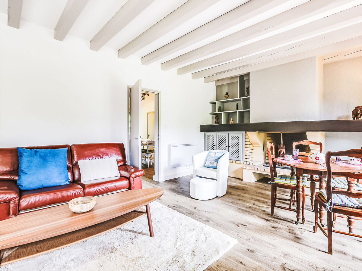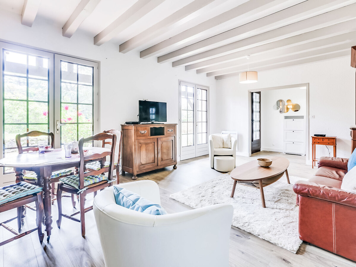 Aménagement confortable et rustique: séjour/salle à manger avec TV (écran plat).