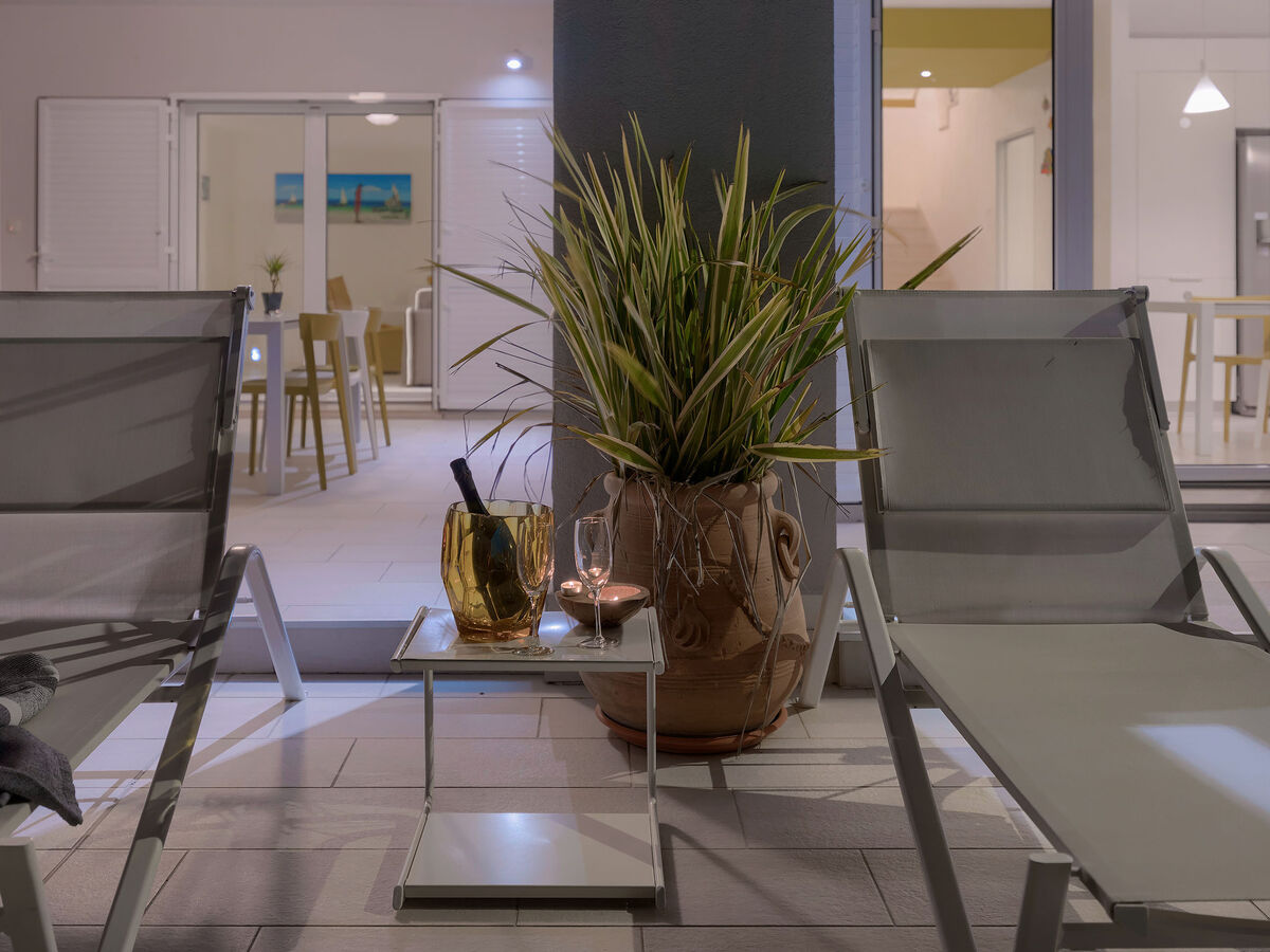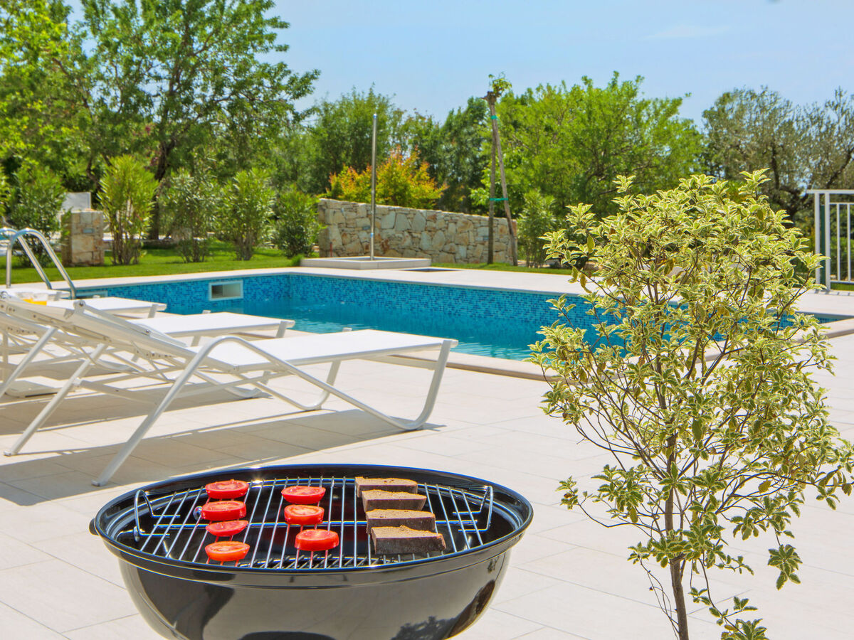 Meubles de terrasse, barbecue (portable), chaises longues.