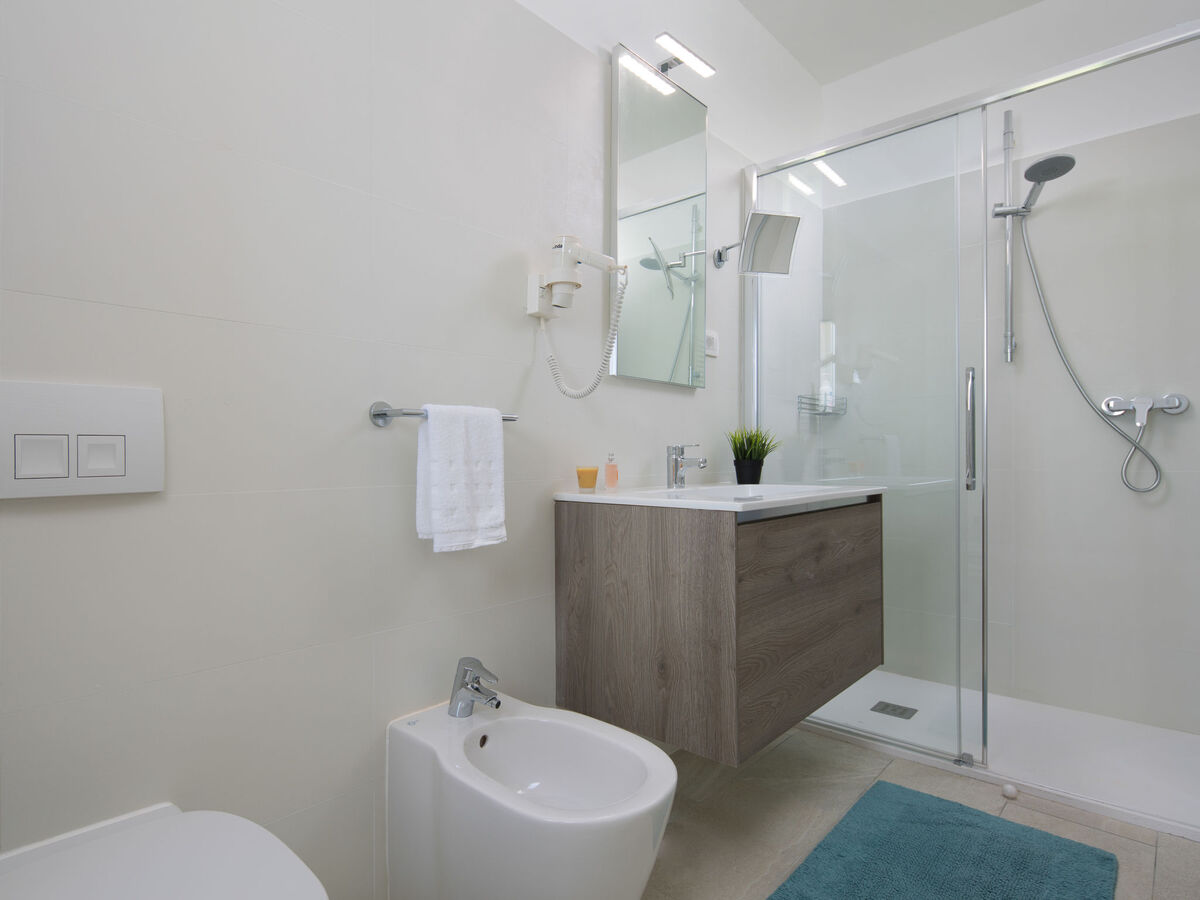 1 chambre avec 1 lit double (2 x 80 cm, longueur 190 cm), douche/bidet/WC et air-conditionné.