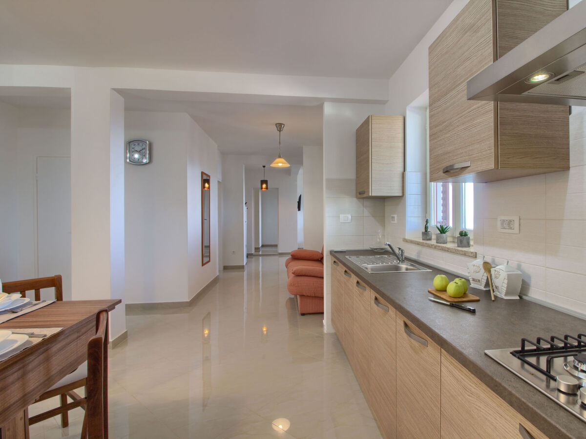 Cuisine ouverte (4 plaques de cuisson, four, lave-vaisselle, micro-ondes, congélateur, cafetière électrique) avec TV (satellite) (écran plat), air-conditionné.
