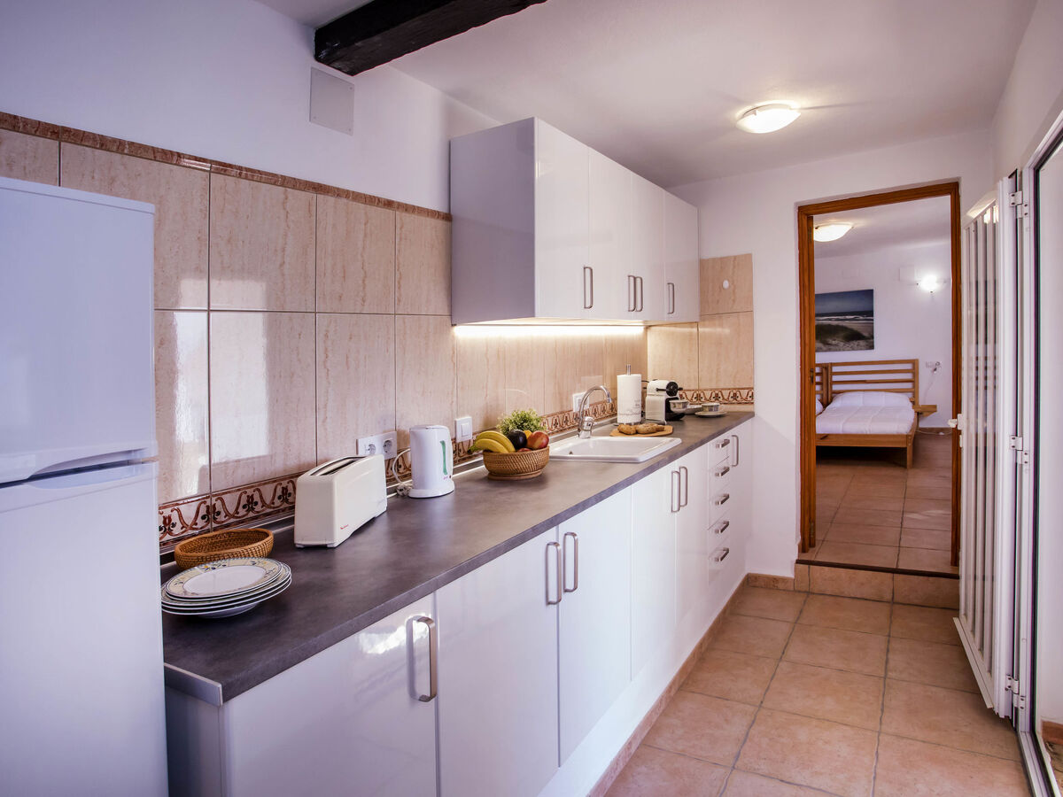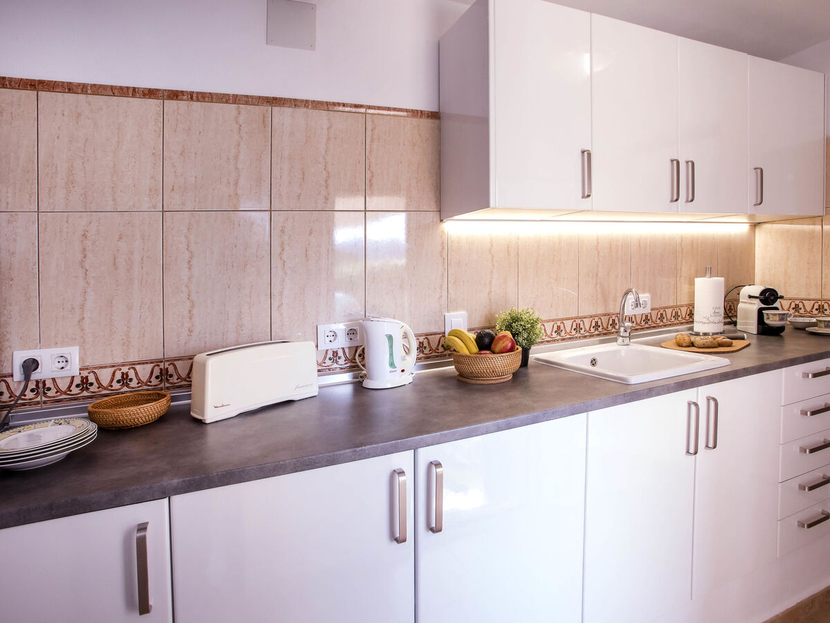 Cuisine ouverte (four, lave-vaisselle, 3 plaques vitrocéramiques, grille-pain, bouilloire électrique, micro-ondes, congélateur, cafetière électrique, Capsules pour machine à café (Nespresso No Caps.)) avec ventilateur.