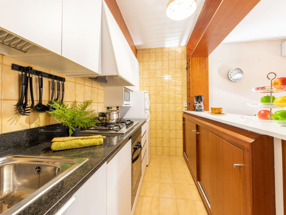 Cuisine ouverte (4 plaques de cuisson, four, grille-pain, micro-ondes, congélateur, cafetière électrique) avec bar.