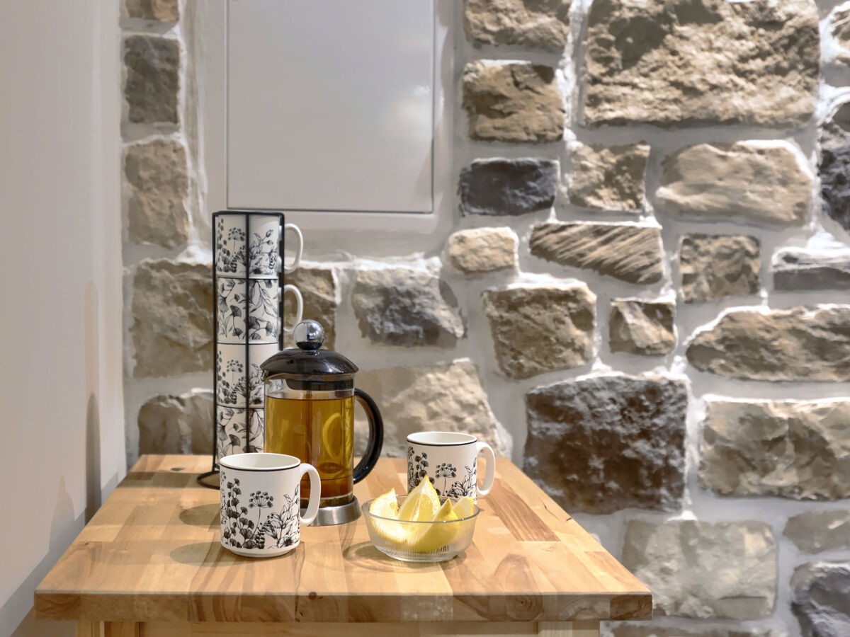 Cuisine ouverte (four, lave-vaisselle, 3 plaques vitrocéramiques, micro-ondes, cafetière électrique).