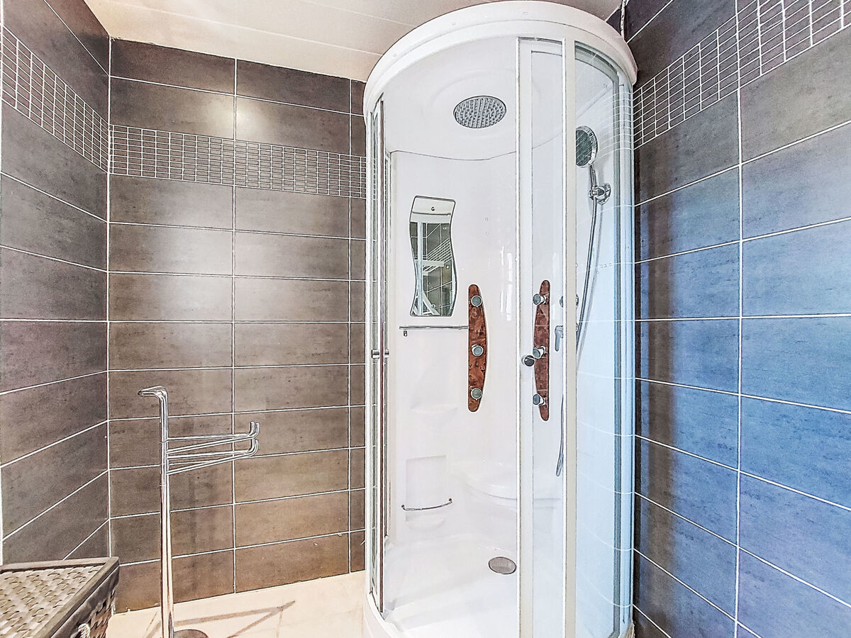 À l'étage supérieur: 1 chambre avec 1 grand-lit (140 cm, longueur 190 cm), douche/WC, air-conditionné et chauffage à air chaud.