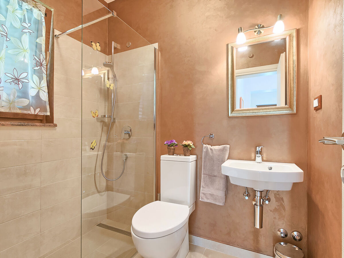 À l'étage supérieur: 1 chambre avec 1 lit double (2 x 90 cm, longueur 200 cm), douche/bidet/WC et air-conditionné.