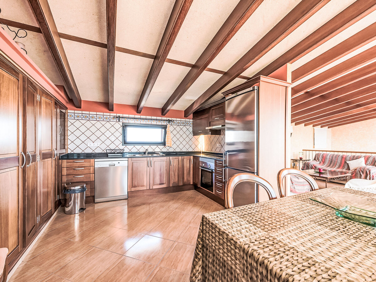 Cuisine ouverte (four, lave-vaisselle, 4 plaques vitrocéramiques, micro-ondes, congélateur, gril, cafetière électrique) avec air-conditionné et chauffage à air chaud.