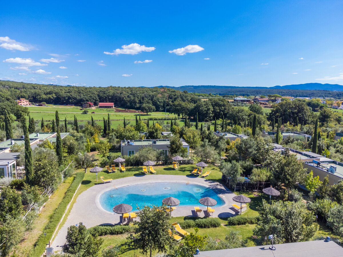 Complexe de vacances moderne "Biovillage", environné par les arbres.