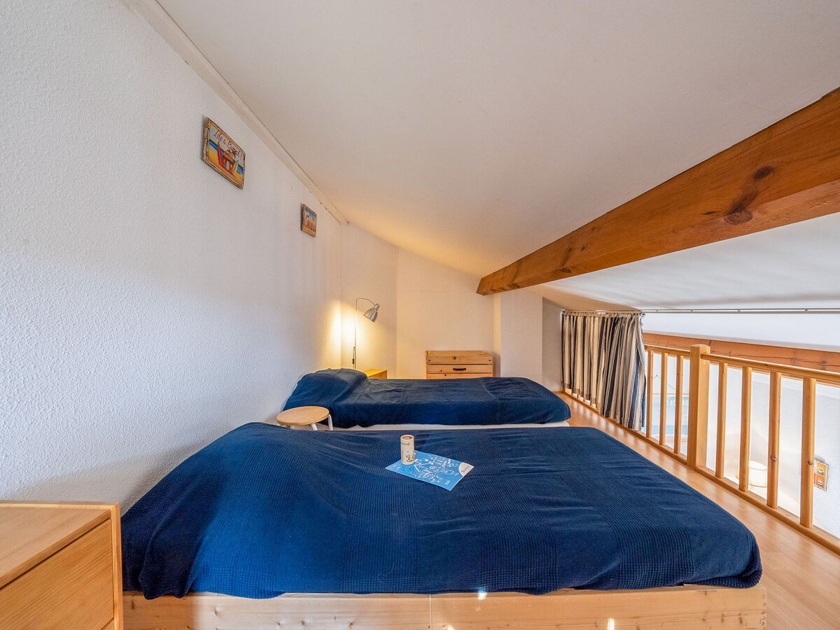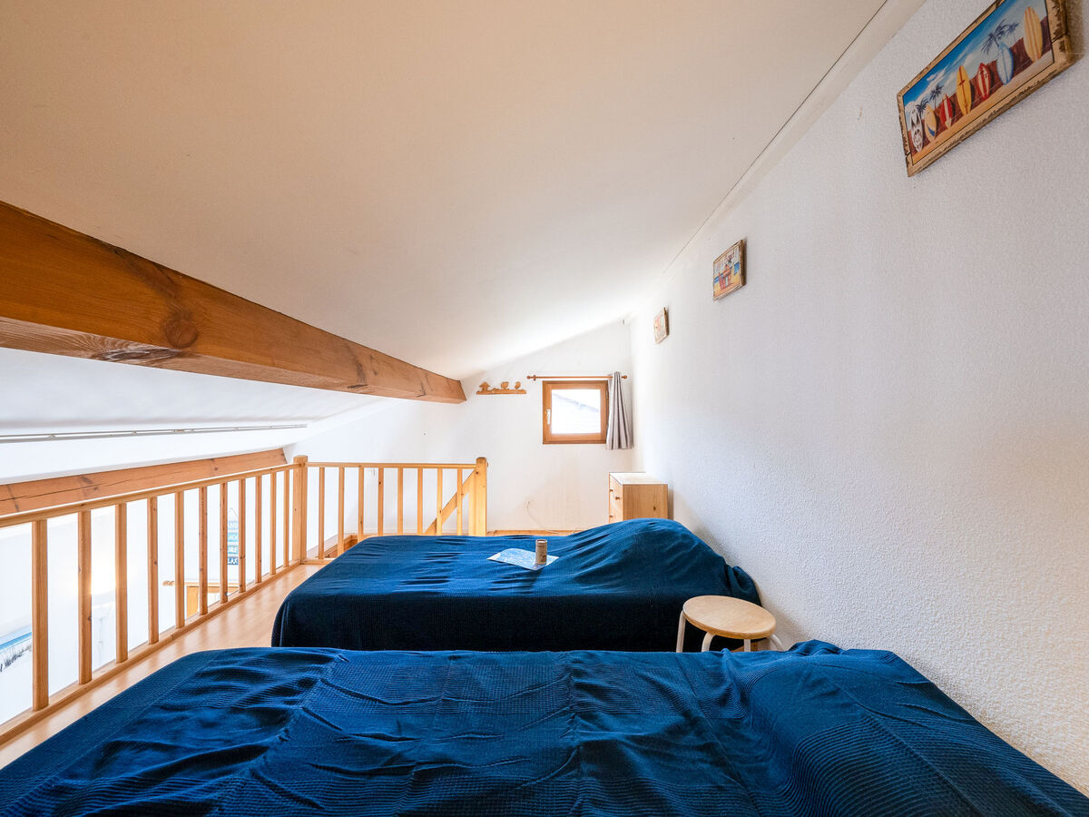 À l'étage supérieur: (escalier raide) galerie, mansardée hauteur plafond 190 - 80 cm avec 2 lits (90 cm).