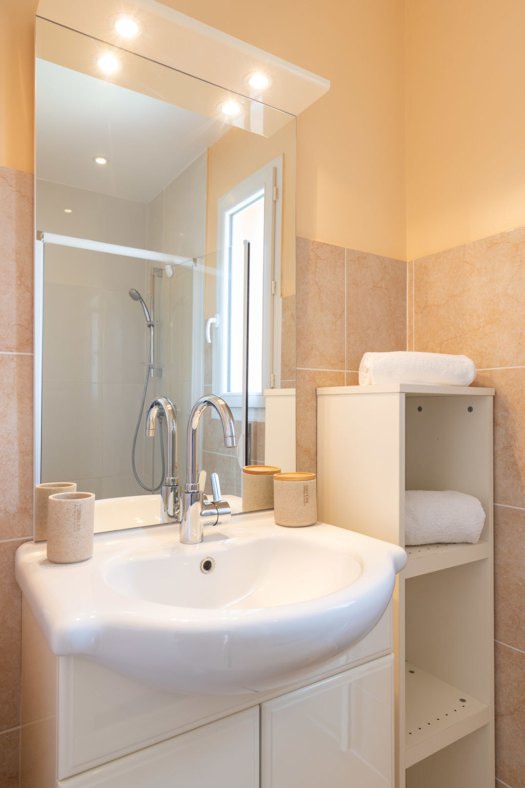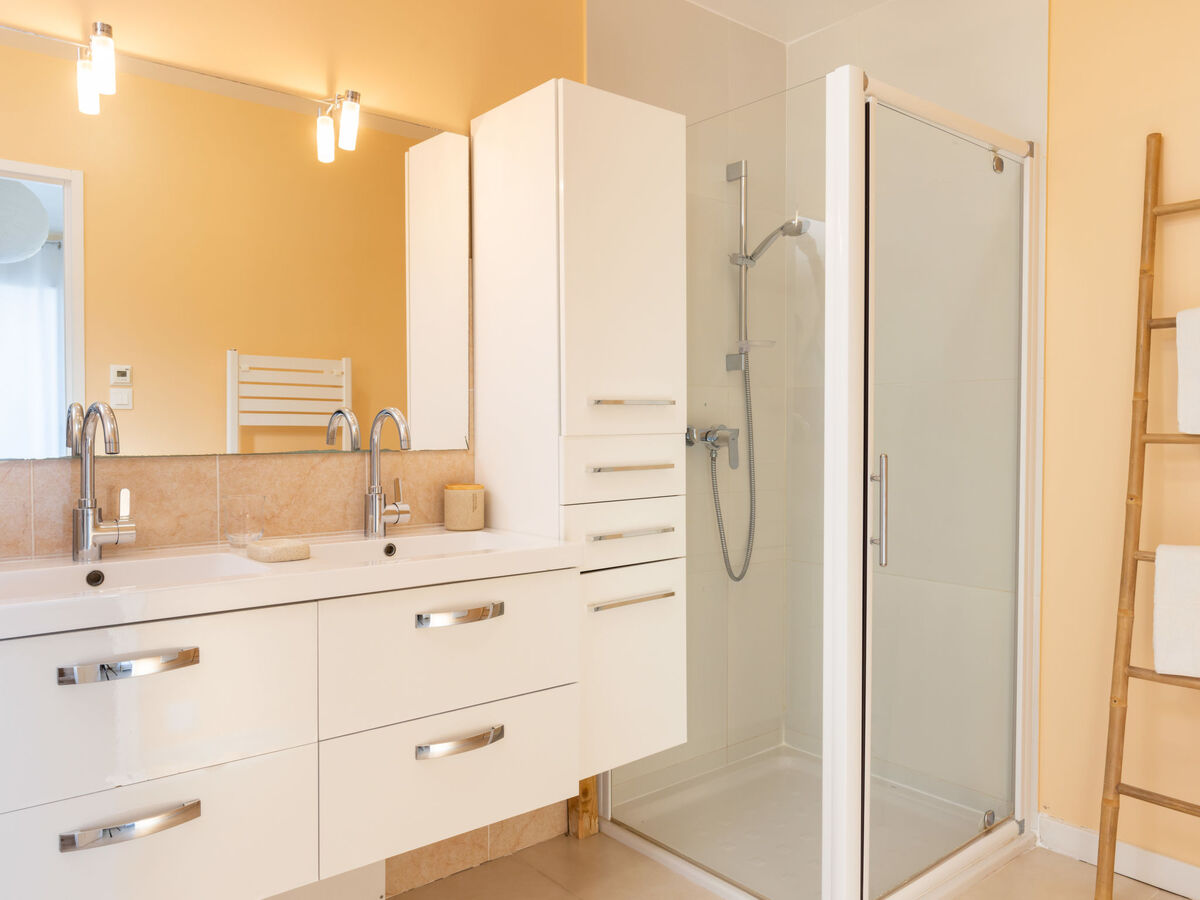 À l'étage supérieur: 1 chambre avec 1 grand-lit (160 cm, longueur 200 cm), douche/WC, double vasque et air-conditionné.