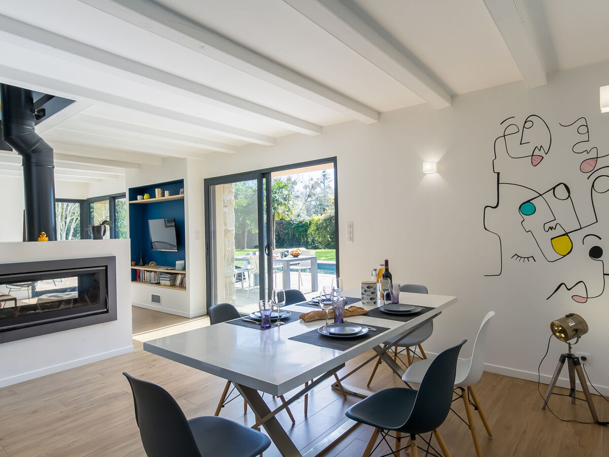 Spacieux et clair, aménagement moderne et de bon goût: séjour/salle à manger avec cheminée, table pour les repas, TV (satellite), chaînes de TV internationales et écran plat.