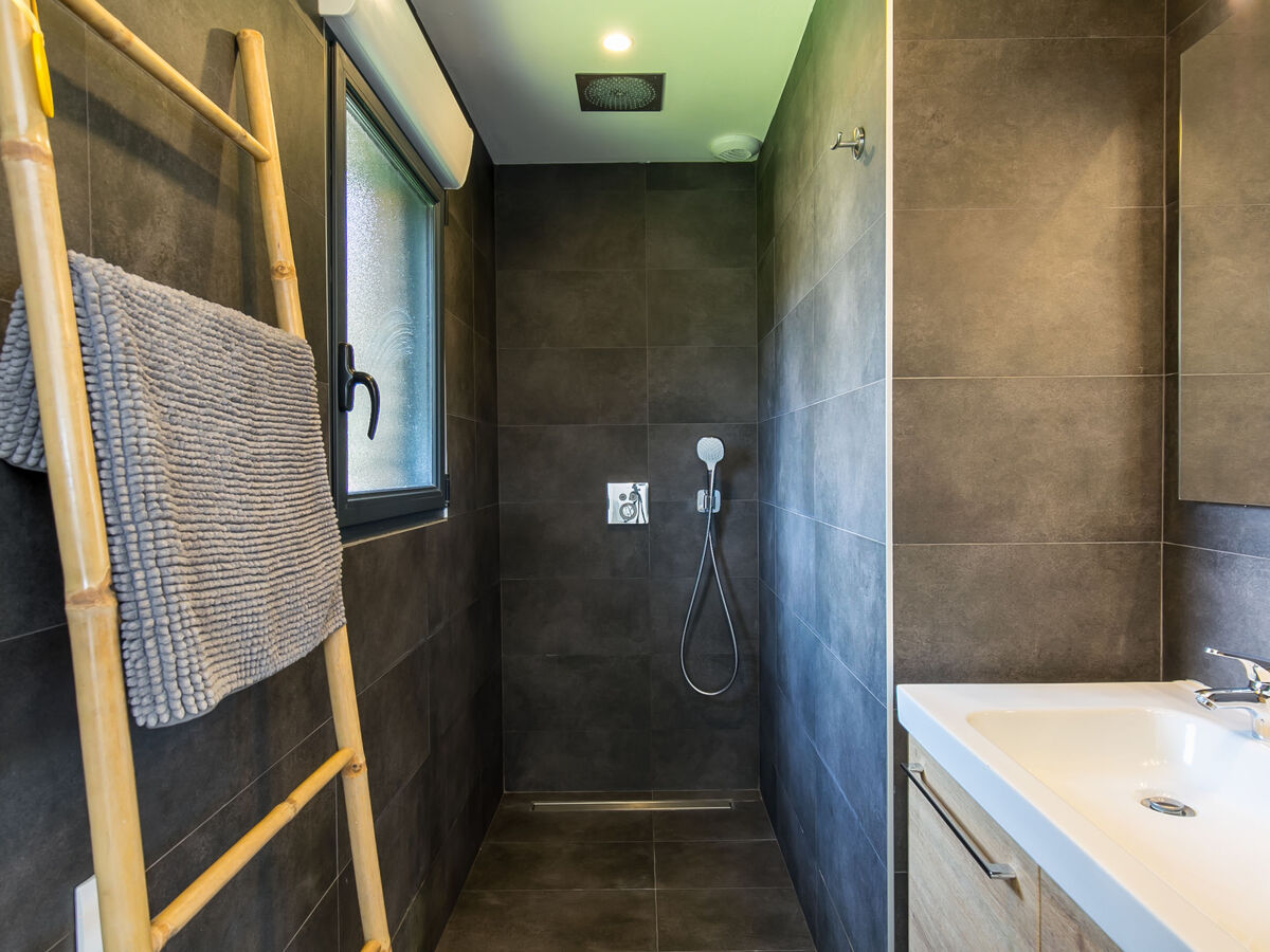 1 chambre avec 1 grand-lit (180 cm, longueur 200 cm), douche et double vasque.