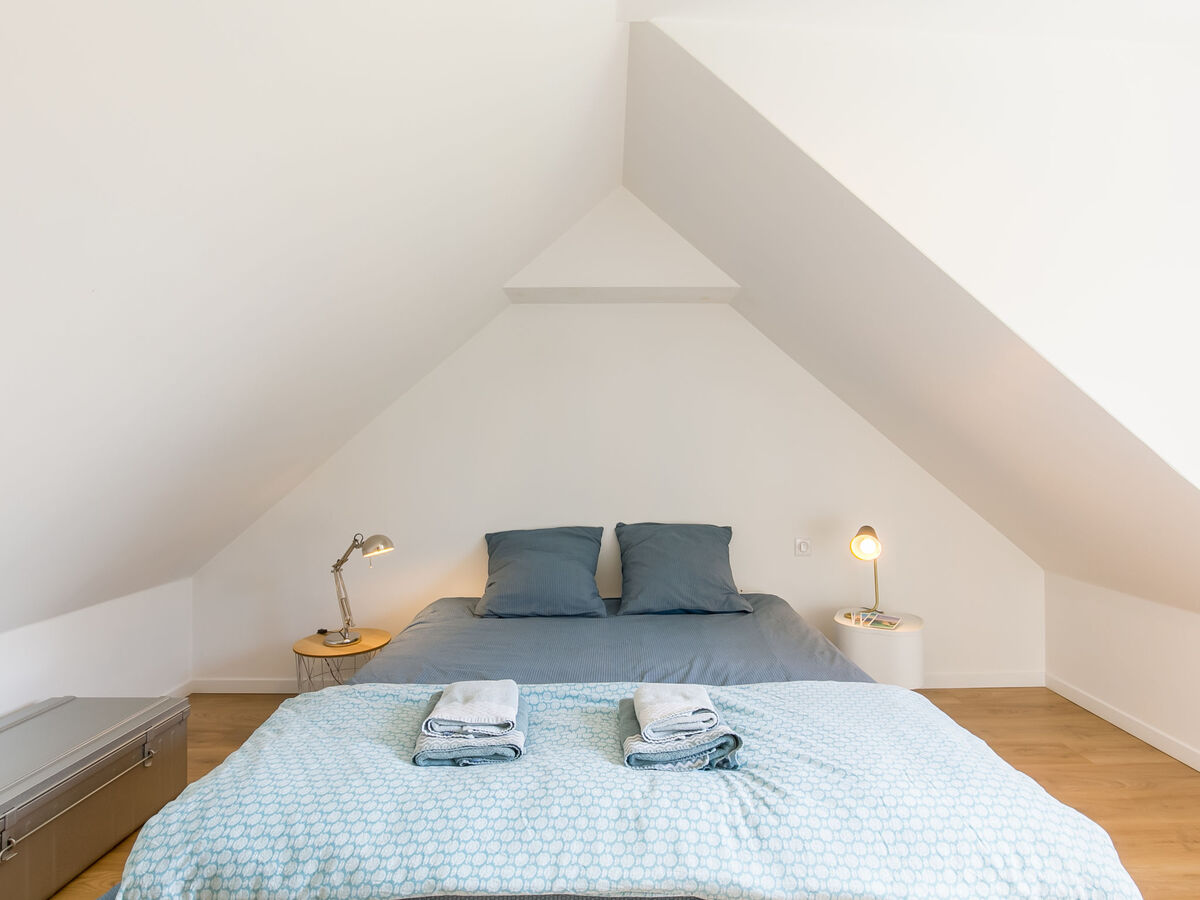 À l'étage supérieur: 1 chambre, mansardée avec 1 grand-lit (160 cm, longueur 200 cm).