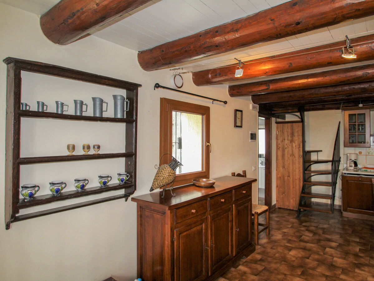 Aménagement fonctionnel et rustique: séjour/salle à manger avec cheminée, table pour les repas et TV (satellite).