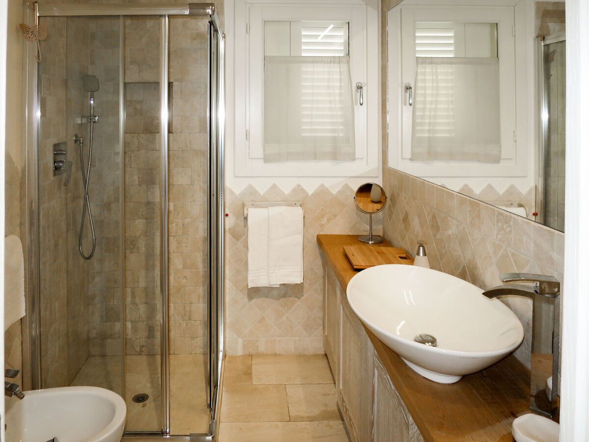 Douche extérieure, terrasse, entretien de la piscine par le propriétaire/jardinier.