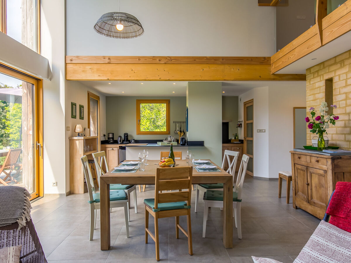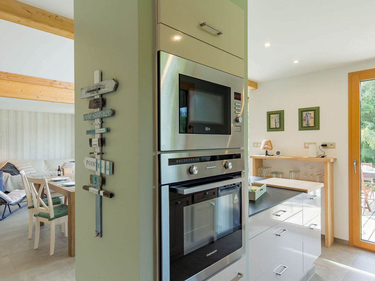 Cuisine ouverte (four, lave-vaisselle, 3 plaques vitrocéramiques, grille-pain, bouilloire électrique, micro-ondes, congélateur, cafetière électrique) avec petite table pour les repas.