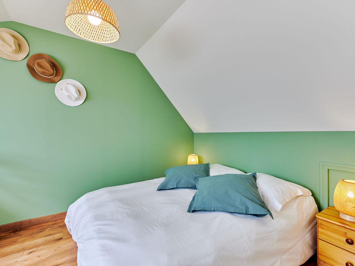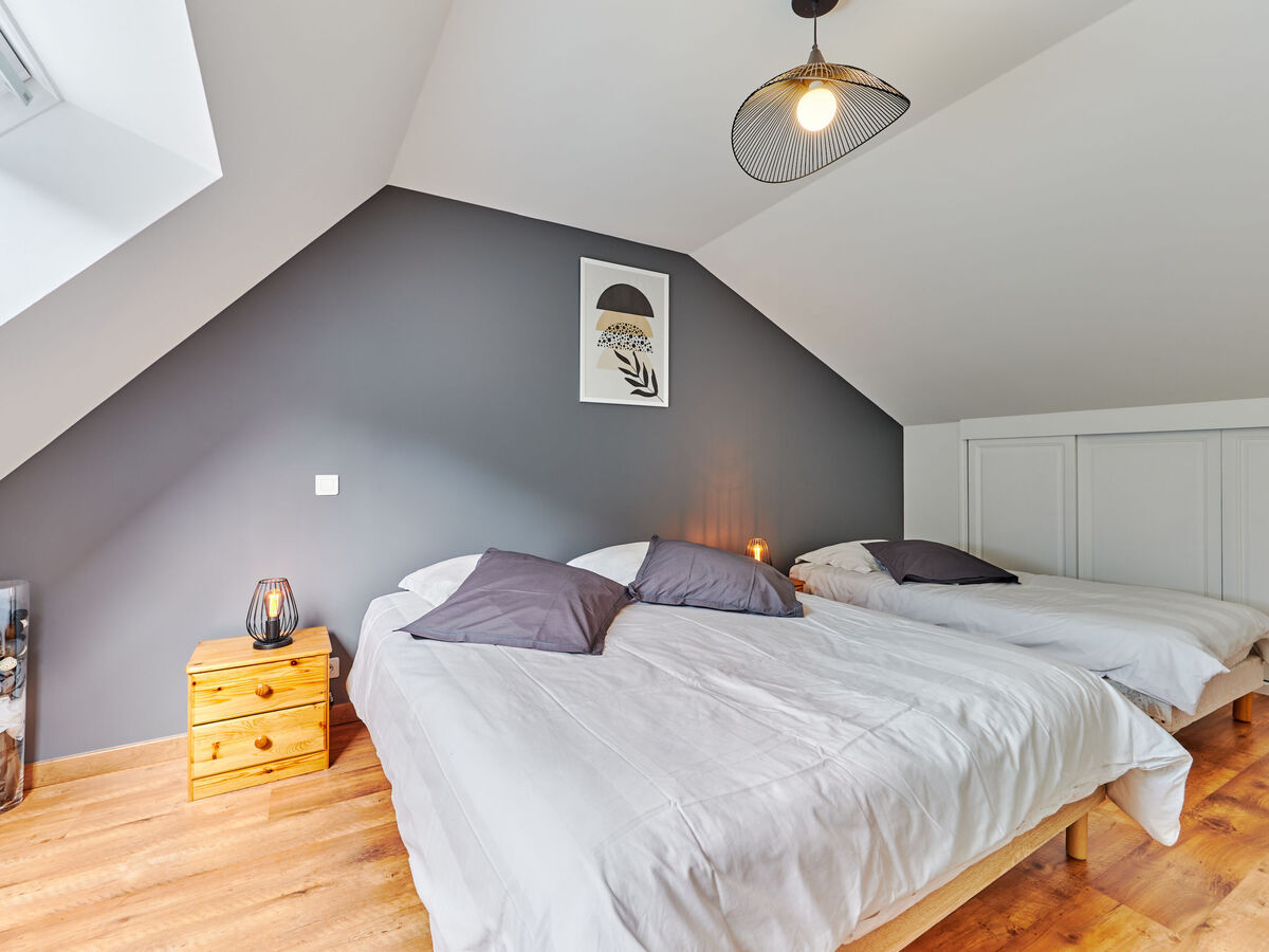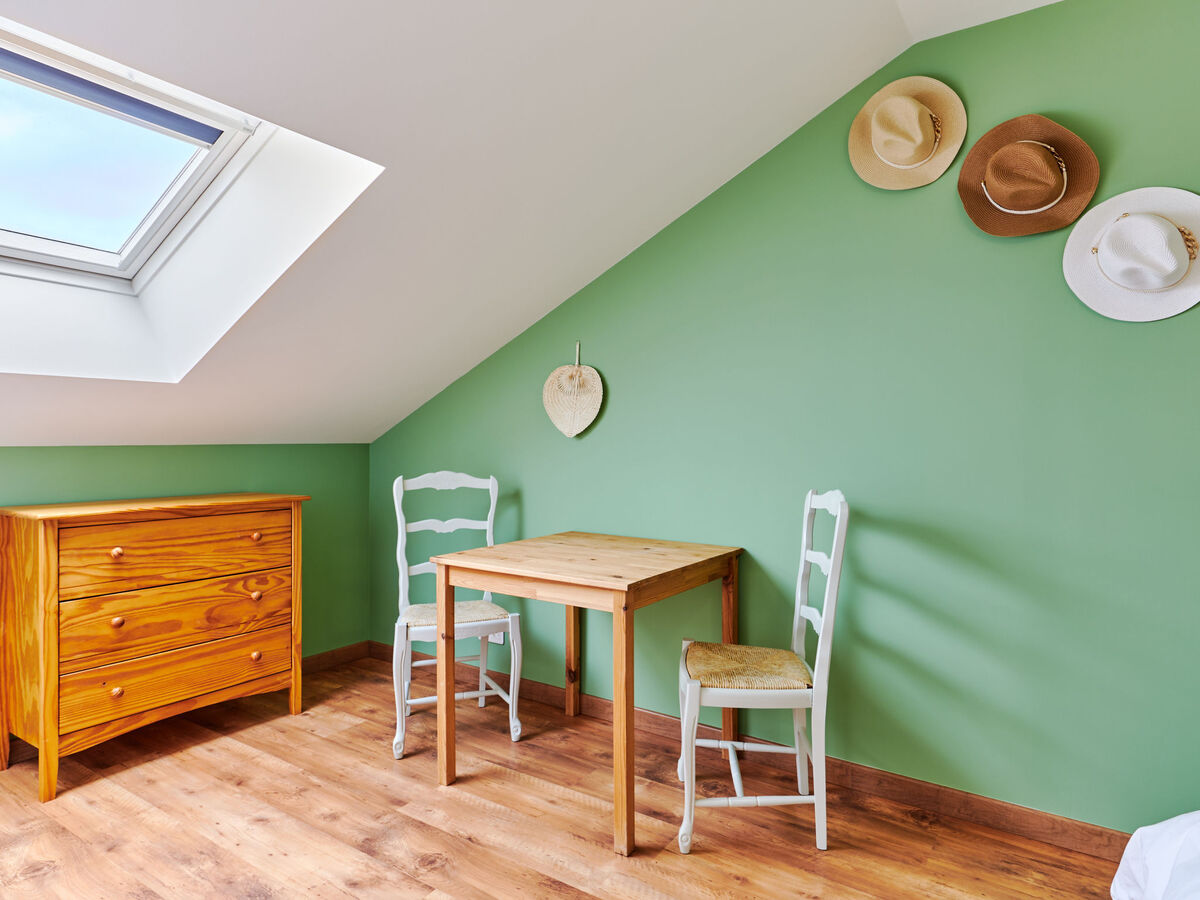 À l'étage supérieur: 1 chambre, mansardée avec fenêtre sous le toit avec 1 lit (90 cm, longueur 190 cm), 1 grand-lit (160 cm, longueur 200 cm).