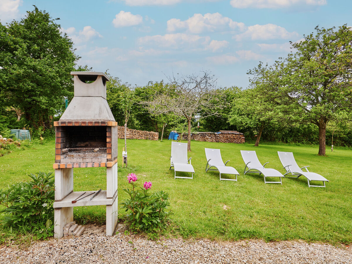 Meubles de terrasse, barbecue, chaises longues (4), réduit.