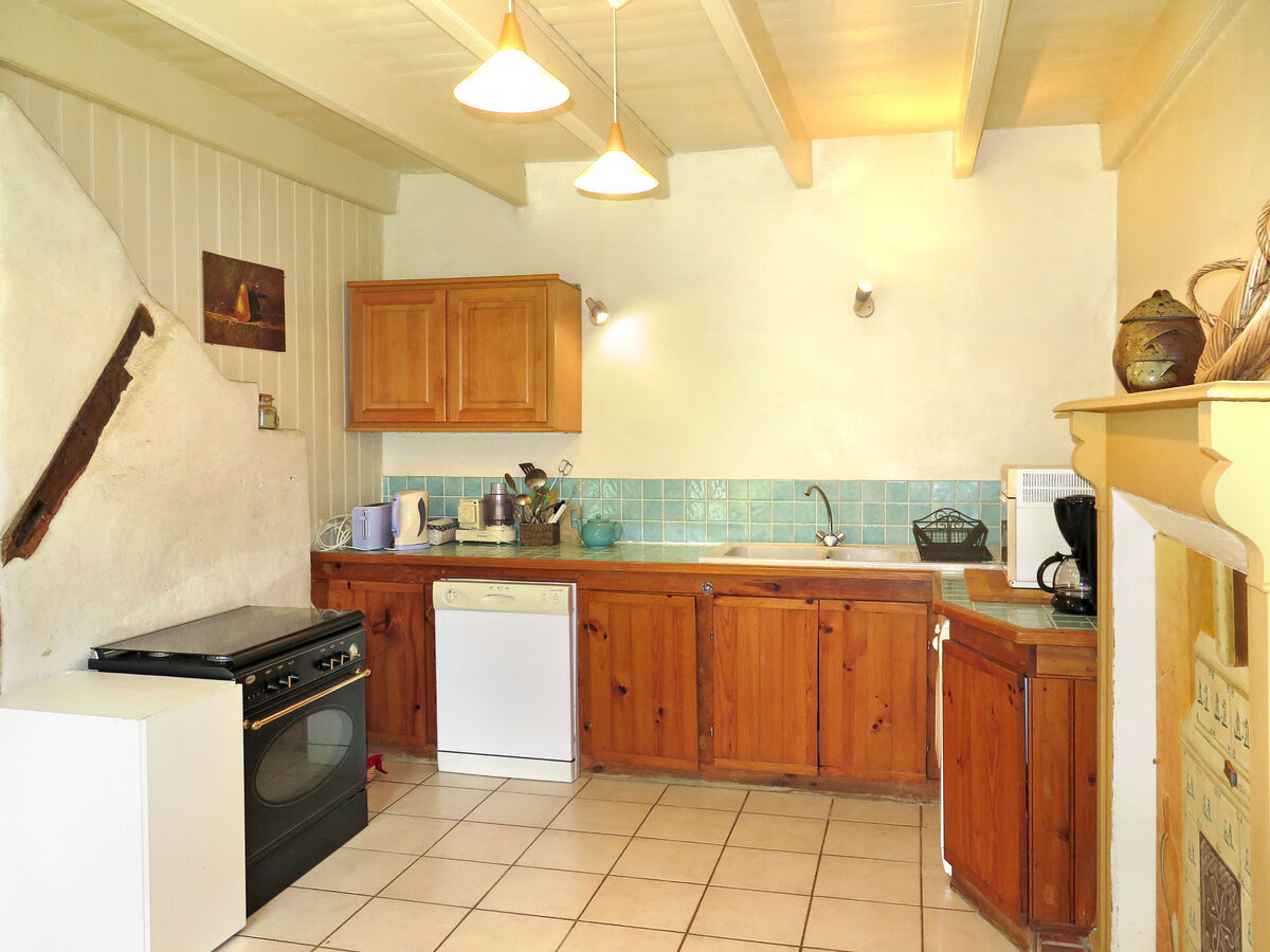 Cuisine (four, lave-vaisselle, 5 feux, grille-pain, bouilloire électrique, micro-ondes, cafetière électrique) avec petite table pour les repas.