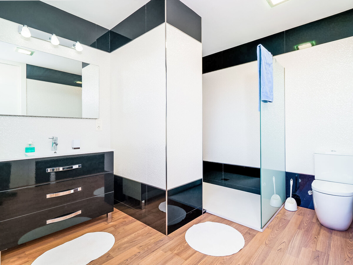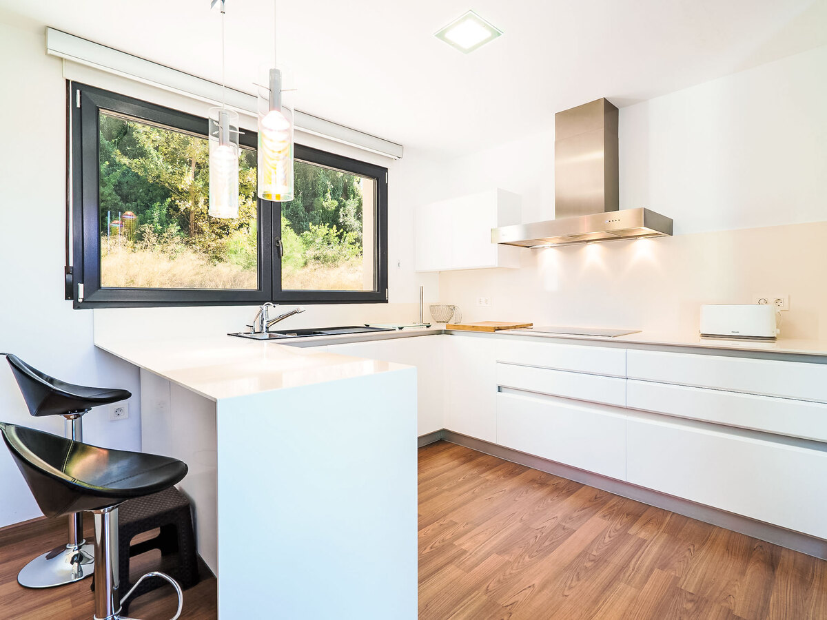 Grande cuisine ouverte (four, lave-vaisselle, 3 plaques à induction, micro-ondes, congélateur).