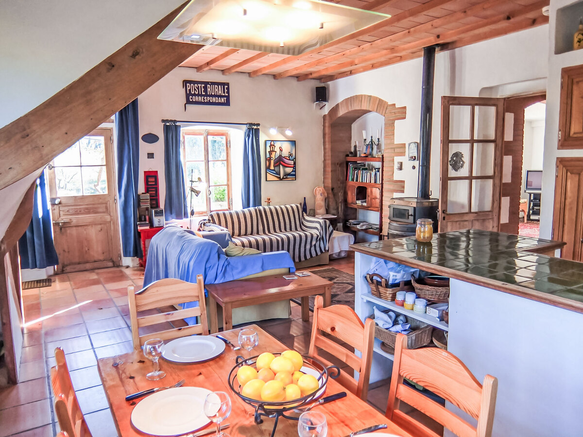 Aménagement rustique: séjour/salle à manger avec poêle à bois.