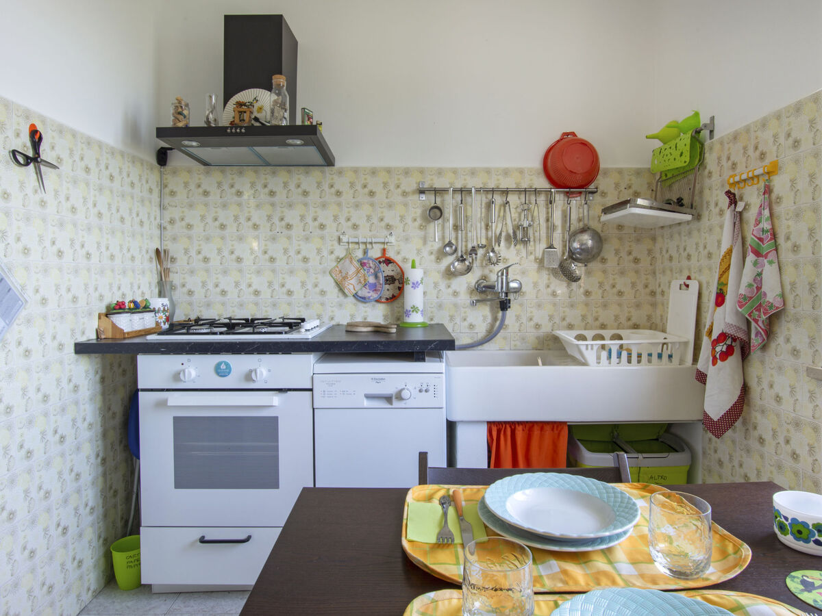 Cuisine (four, lave-vaisselle, 4 feux, micro-ondes, congélateur) avec petite table pour les repas.